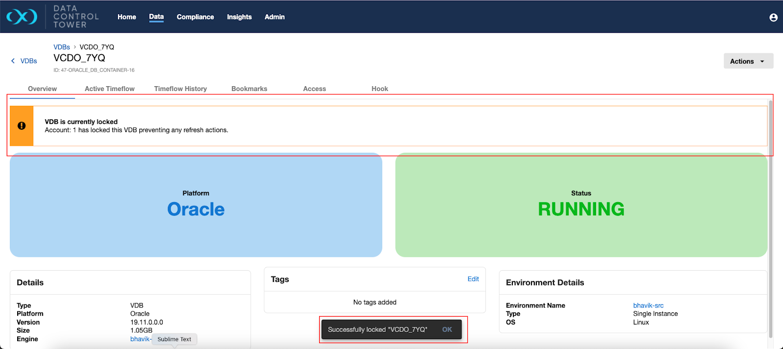 A warning message is shown on the VDB detail page if the VDB is locked by a user.