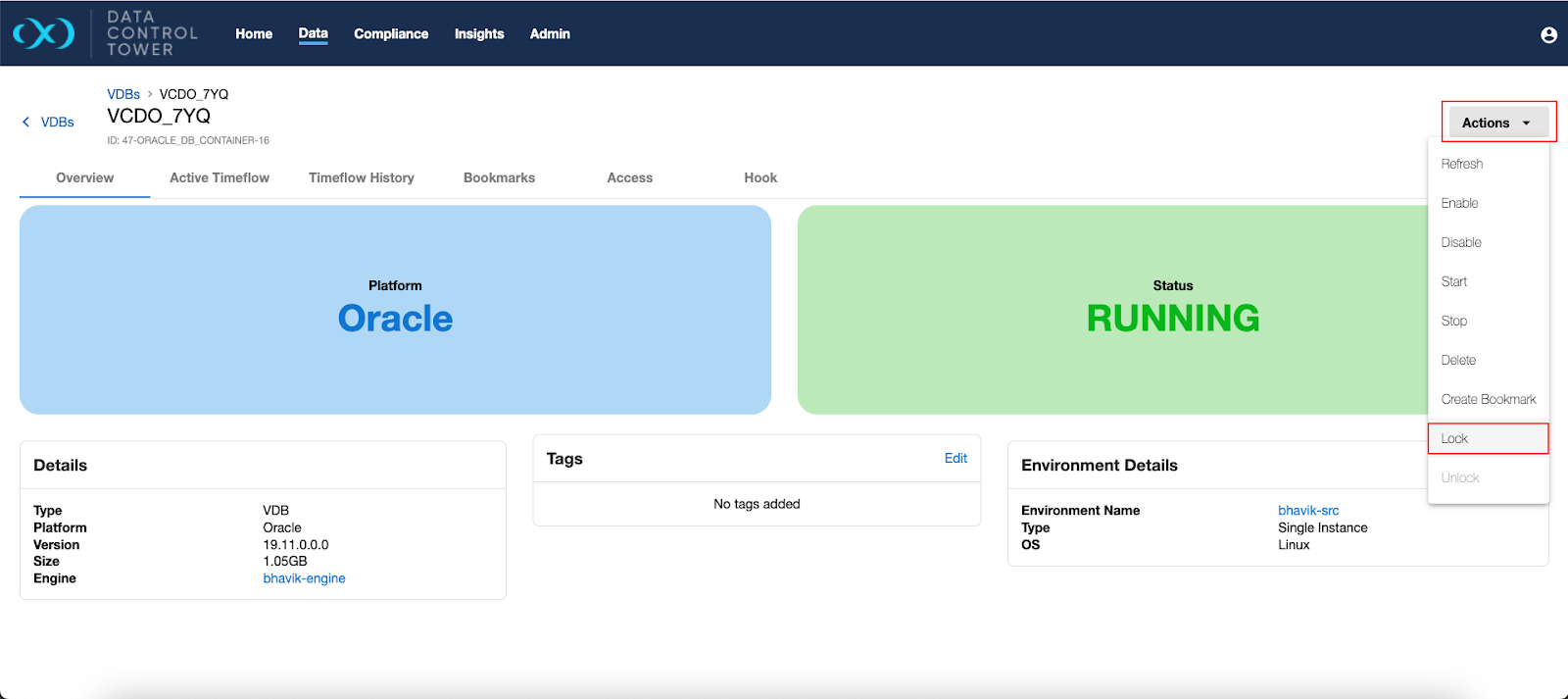 The VDB details page has the options to lock and unlock a VDB under the Actions menu. All VDBs are in the unlocked state by default, thus, the only option available at first is to lock the VDB.