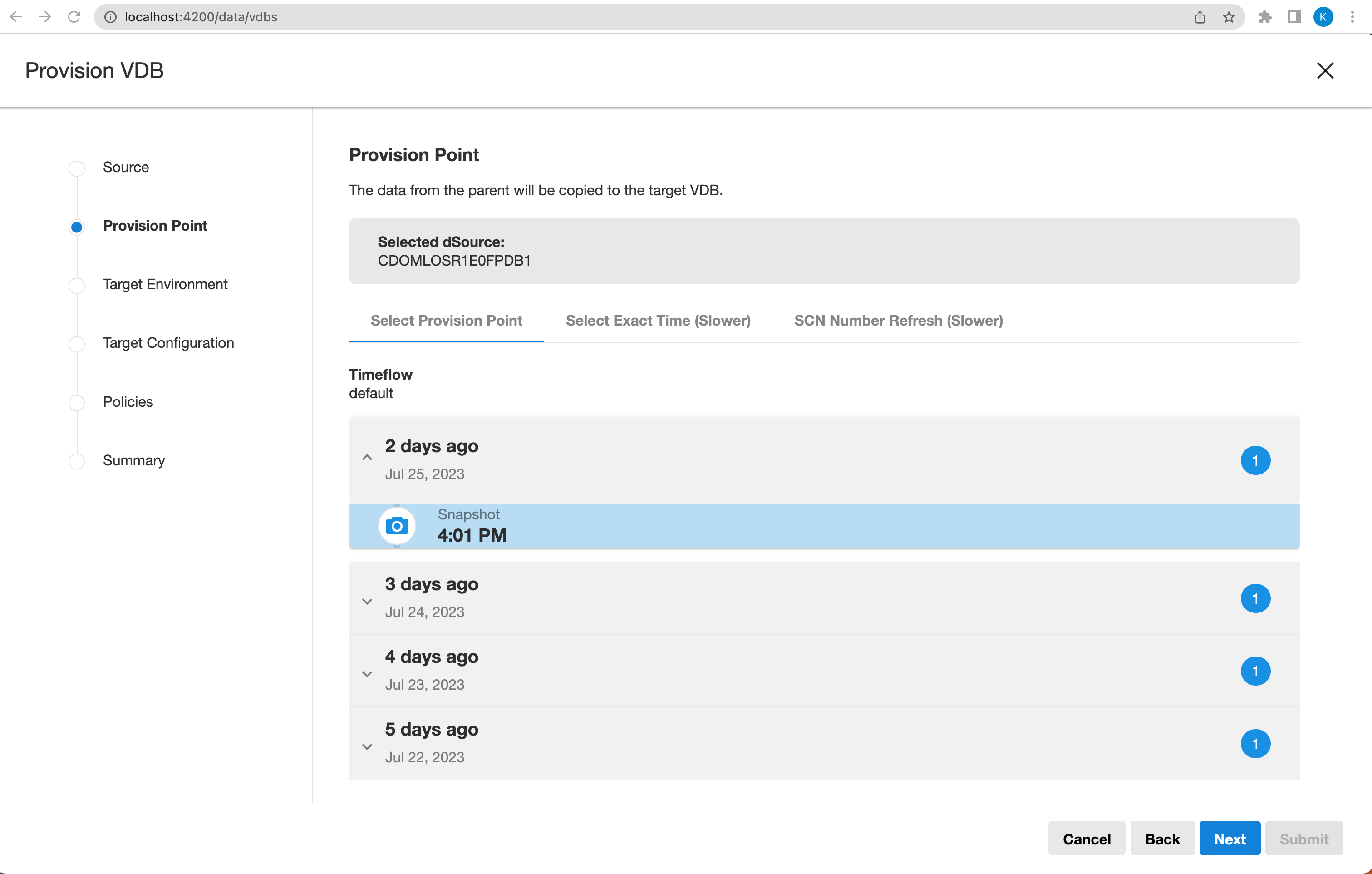 Source: search and select either a dSource or VDB to provision from.