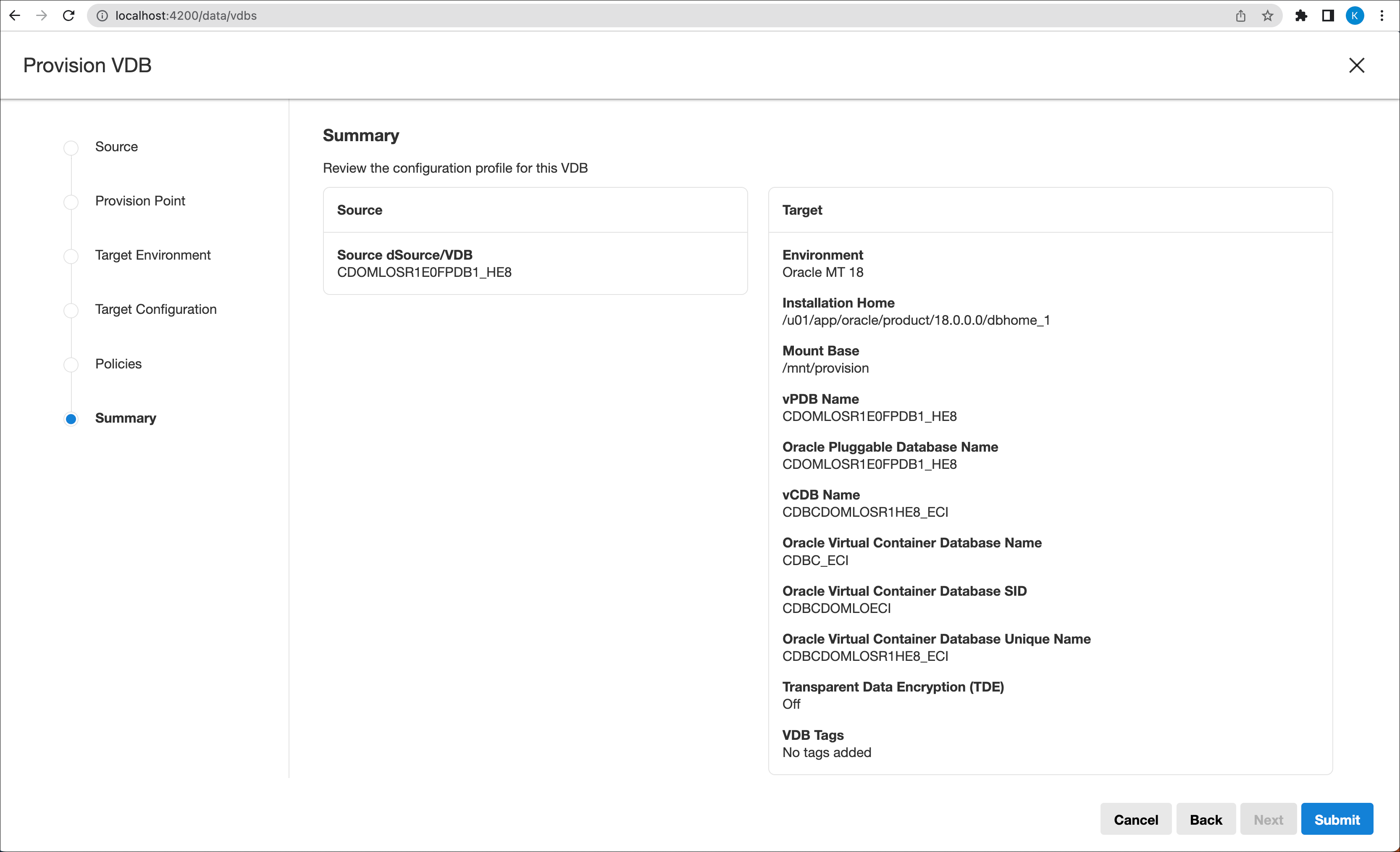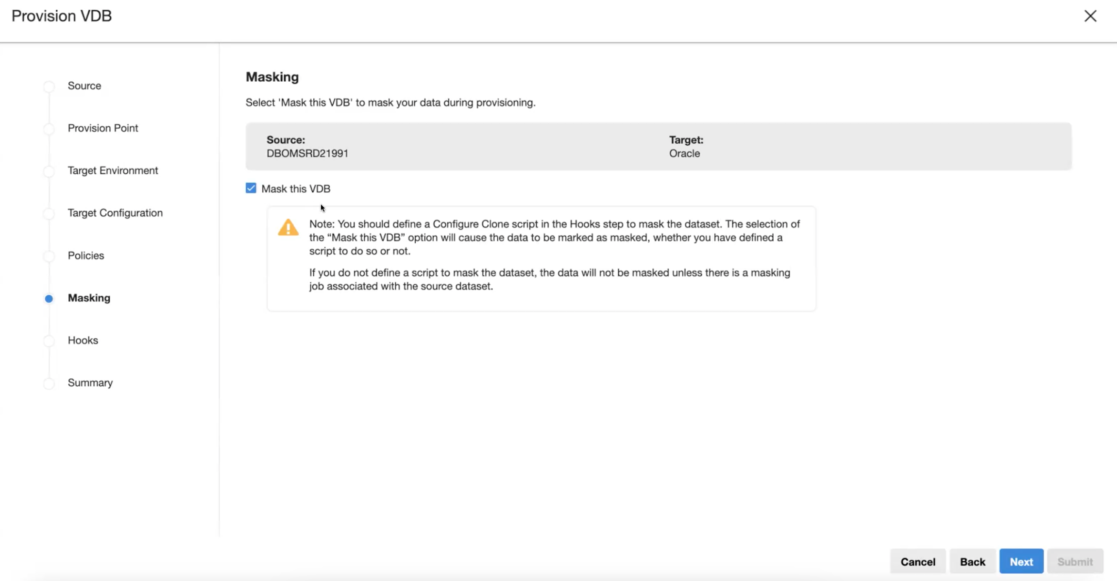 Summary: review the selections that have been made. In 10.0 and above, a hooks header has been added to the Summary page that shows a list of all the hooks configured for Hook Operations while provisioning a VDB (if this was configured).
