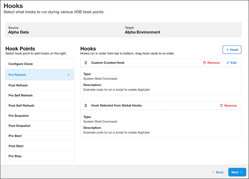 Hooks: Delphix users now have the ability to add custom hooks to a VDB at the time of provision (as part of the provision wizard UI) and update them under a VDB detail page, so that they will execute during refresh operations. A Hooks section in the Summary page shows a list of all the hooks configured (if any). Hooks can be modified in the details page after creation.