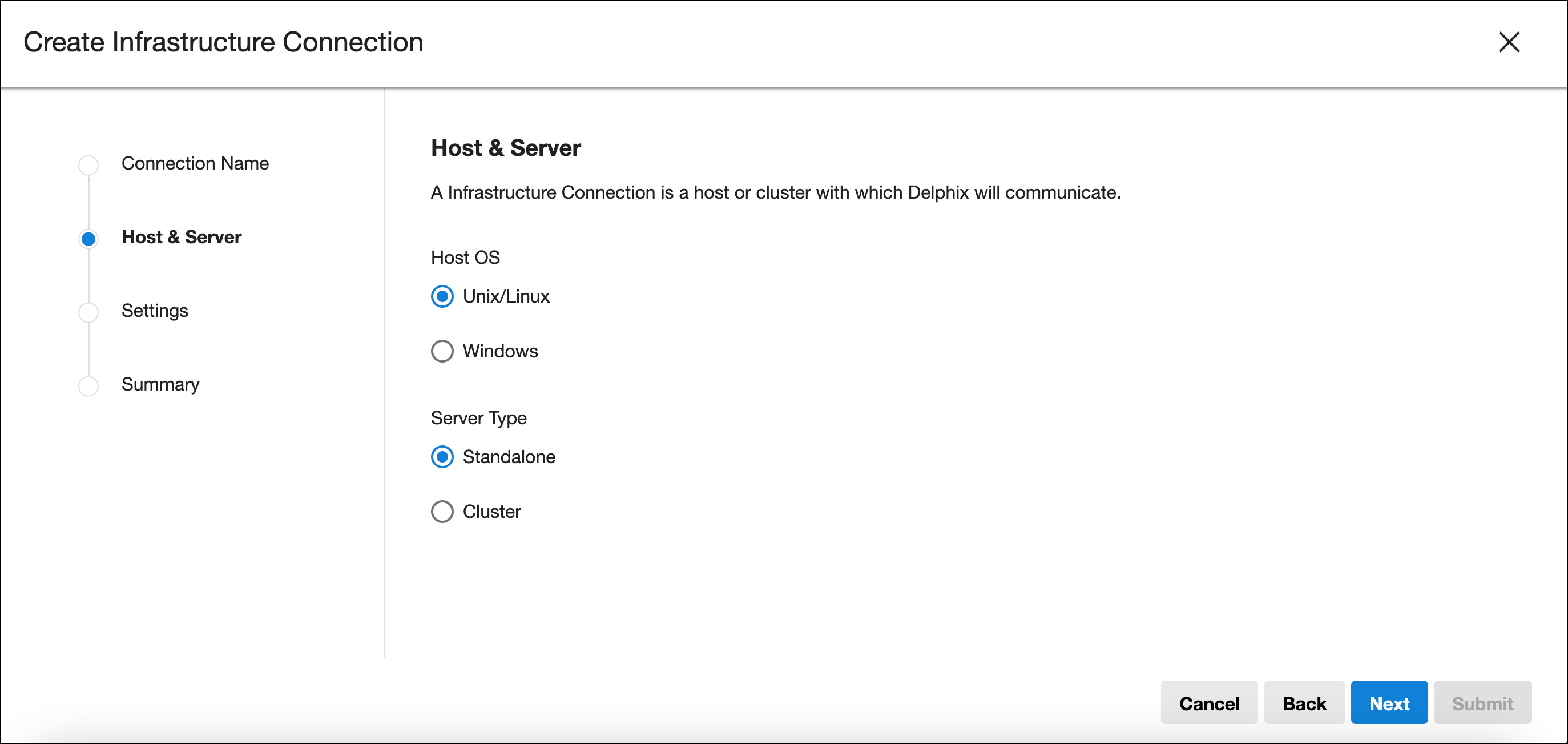 Select the Host OS, Server Type, and Host Type (applicable to Windows).