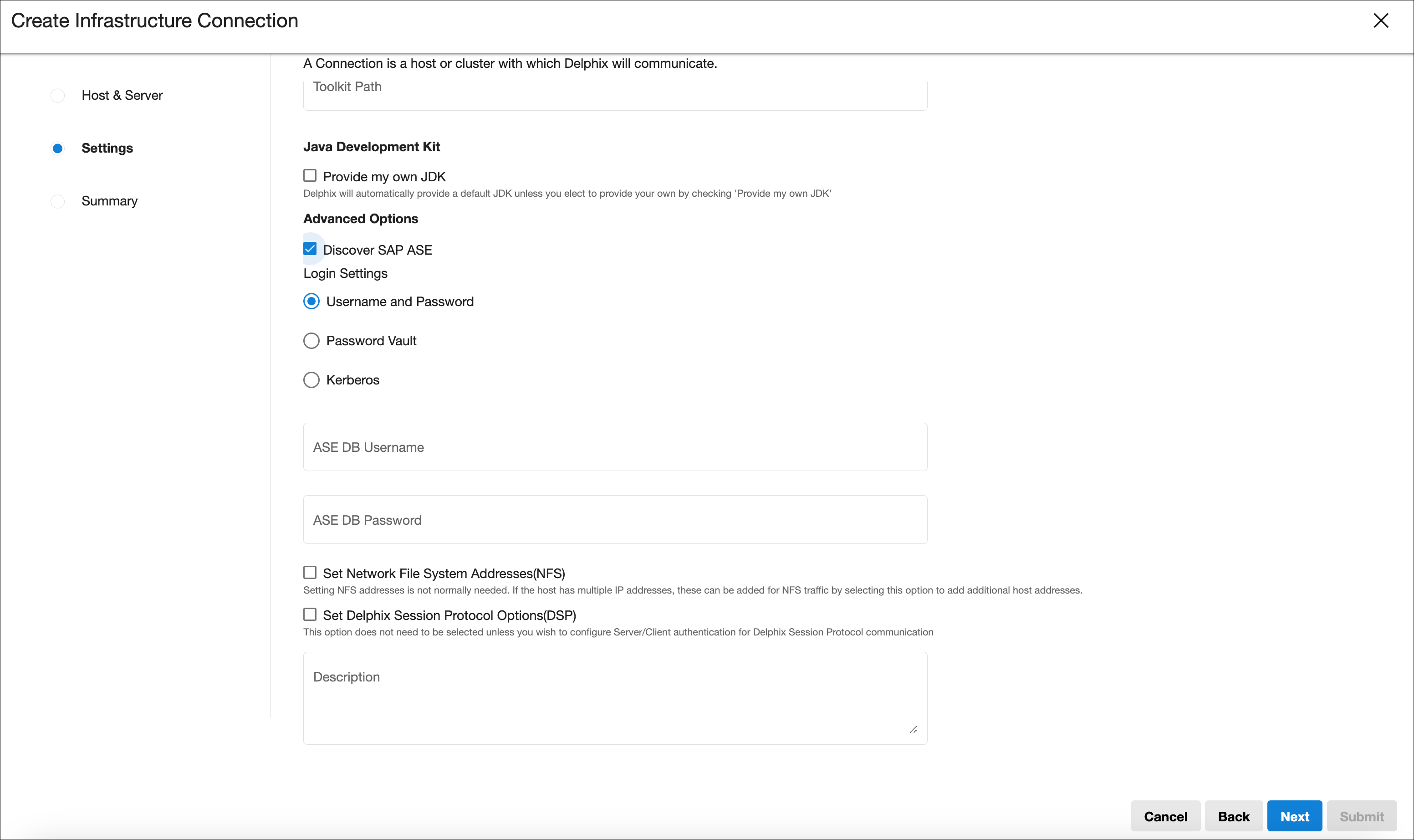 A wide range of Login Settings are available for the OS user and to Discover SAP ASE (if applicable), like username/password, username/public key, Password Vault, or Kerberos.For vaults, HashiCorp and CyberArk vaults are supported.