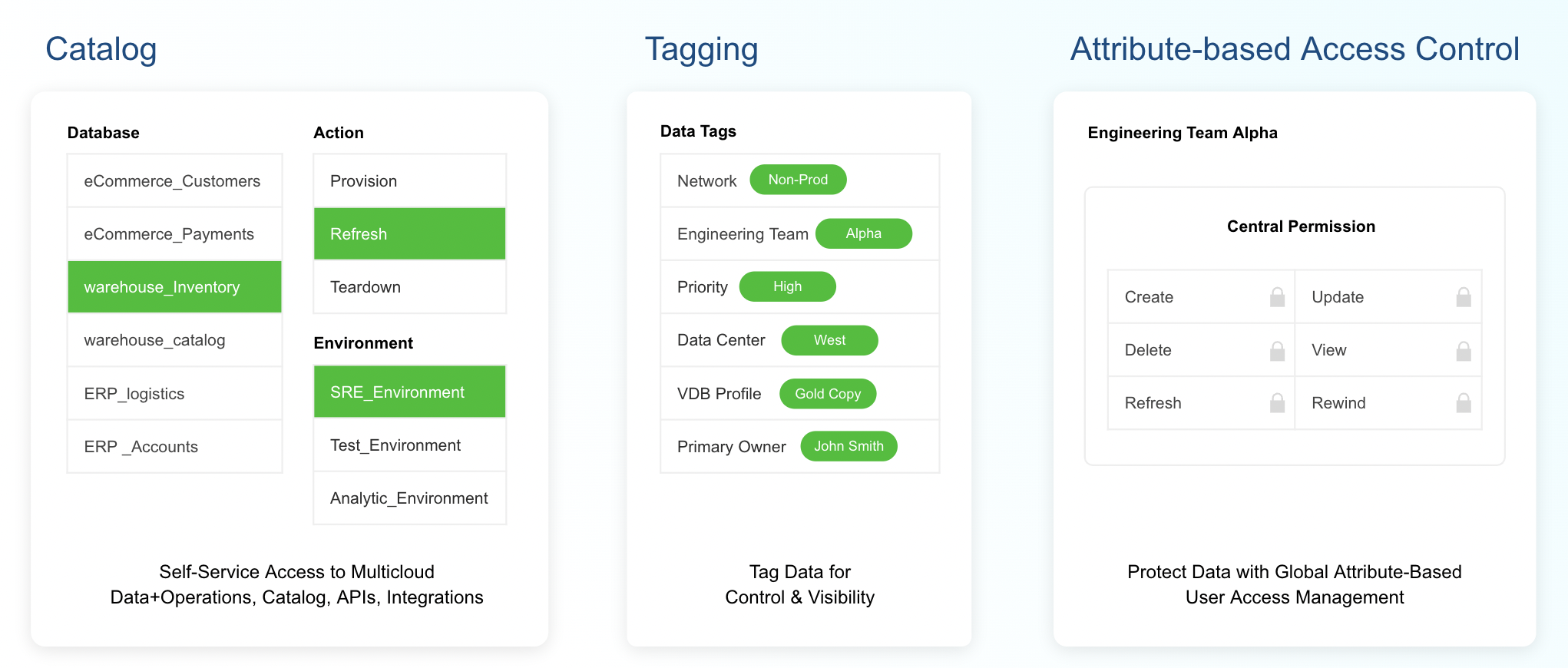 DCT delivers a management layer on top of all connected Delphix engines through surfacing object inventories, instrumenting all common Delphix operations, delivering a business metadata layer with tagging, and using those tags to drive attribute-based access control. This provides the ability for administrators to deliver a highly curated and secure Delphix experience for automation and end-users.