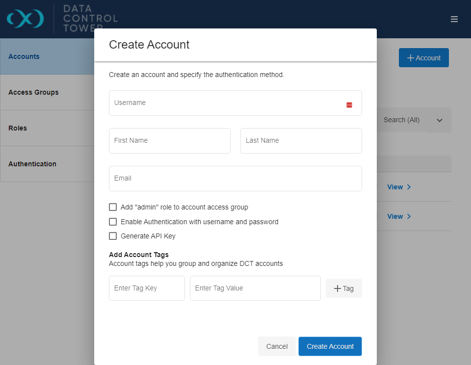 Navigate to Admin > Accounts, click the “+ Account” button, and complete the form.