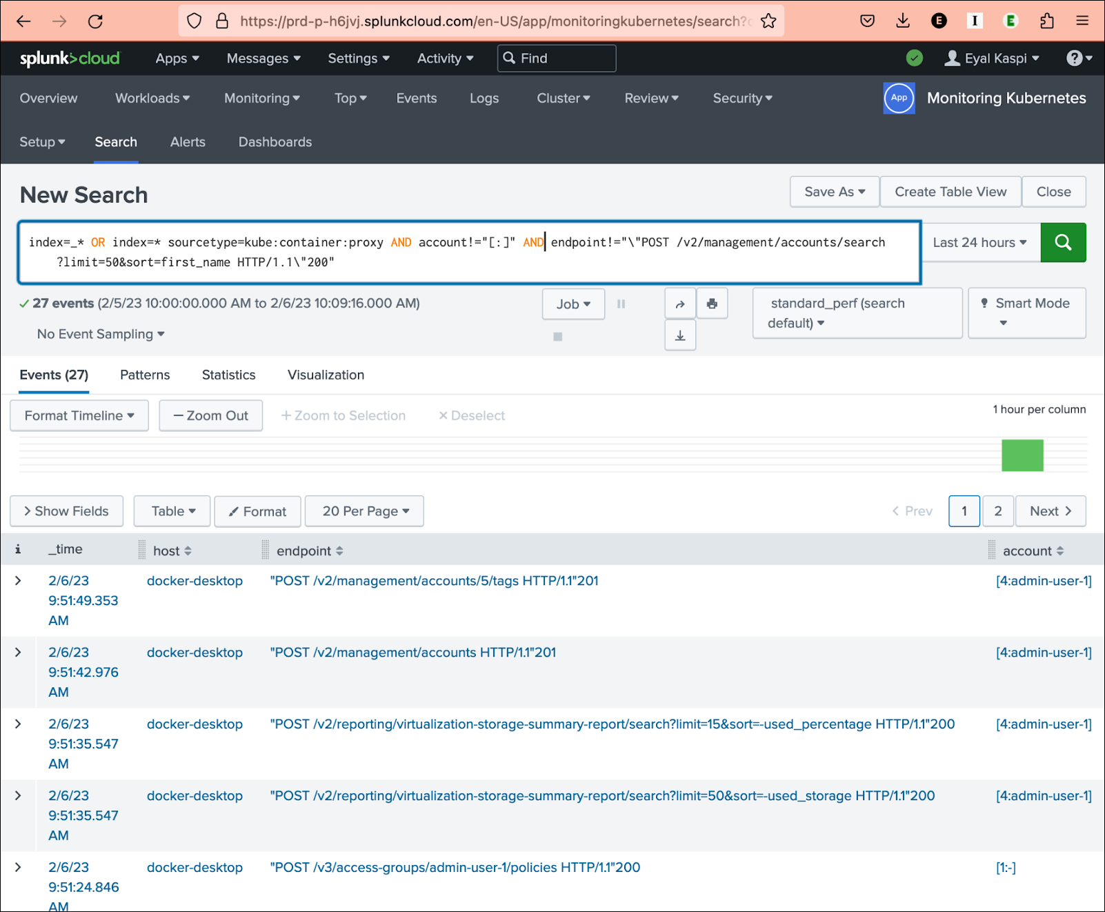 The example screenshot below shows a search for \”nginx\”, with use of the “extract new fields” wizard on the bottom left, which has Splunk parse the Nginx access logs. A regexp is used to name some of the fields like ipaddress, endpoint, accountid, etc. The example runs a search to return API requests associated with accountid.