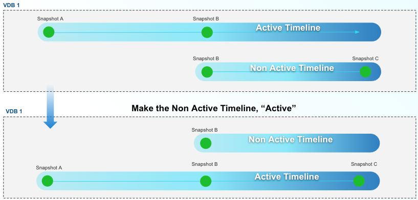 Non-active timelines (previously, “timeflows”) are a critical aspect to data virtualization, in addition to being an important tool for developers. Whenever a time-based operation takes place, the previous timeline (and associated data) becomes non-active, and a fresh timeline takes its place.