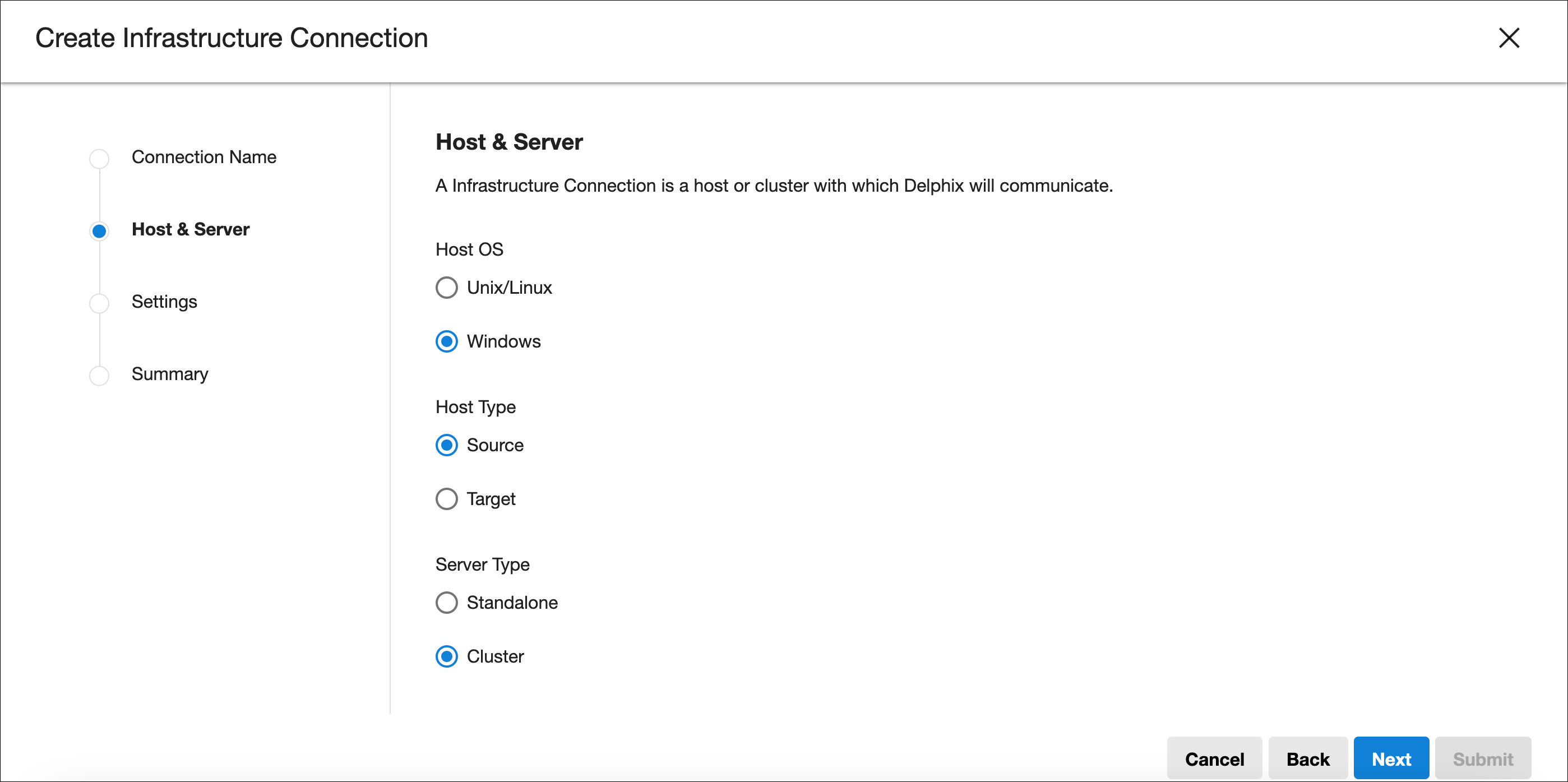 Select the Host OS, Server Type, and Host Type (applicable to Windows).