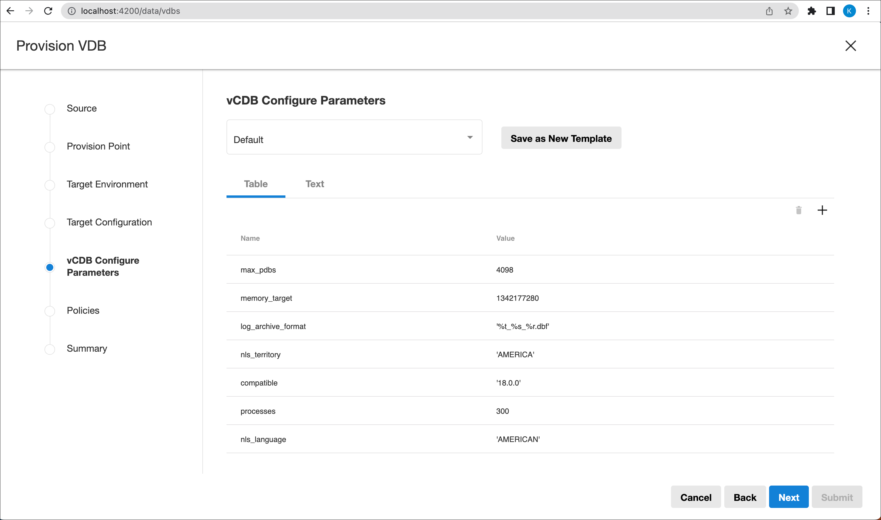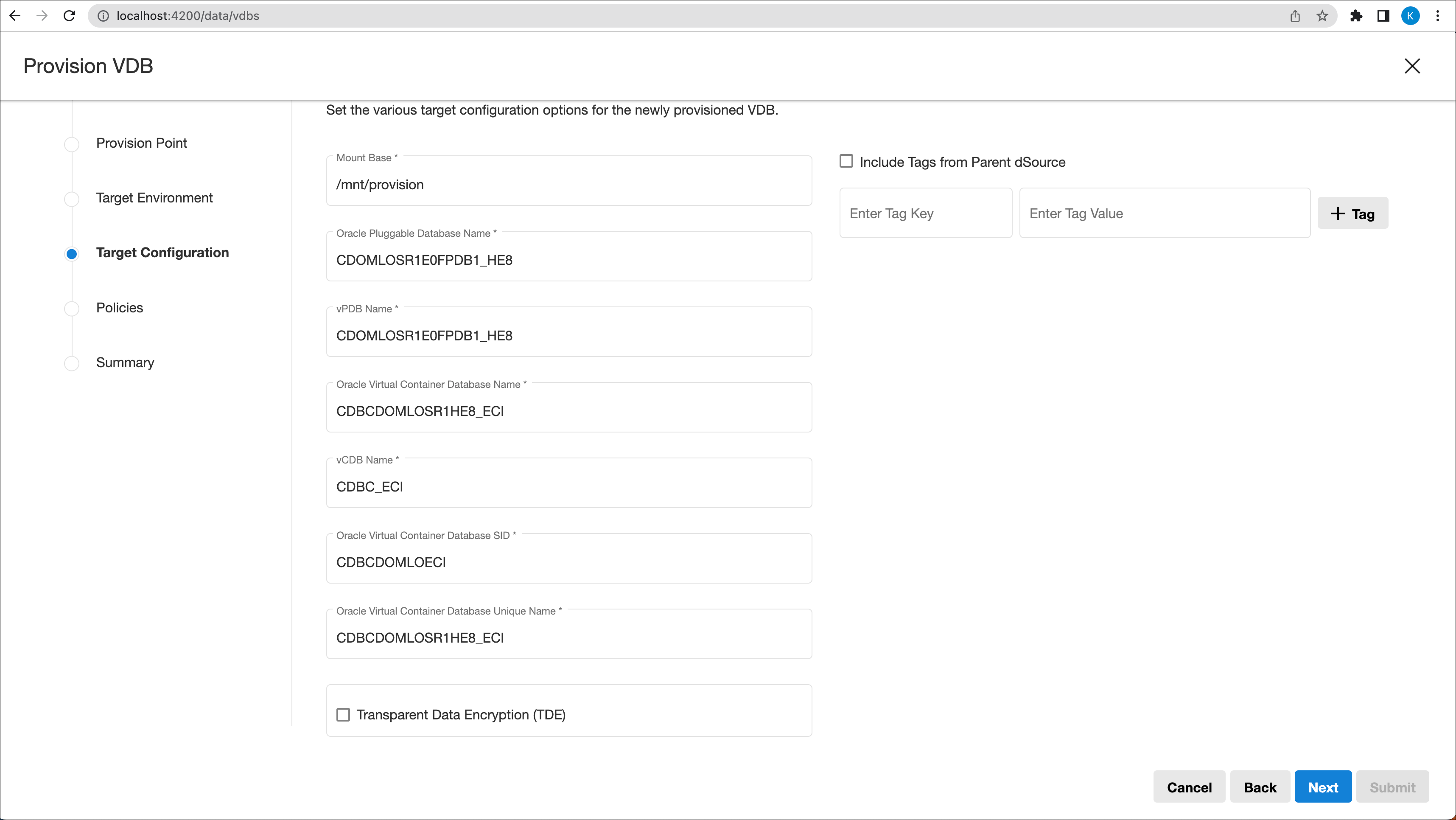 VDB provisioning wizard