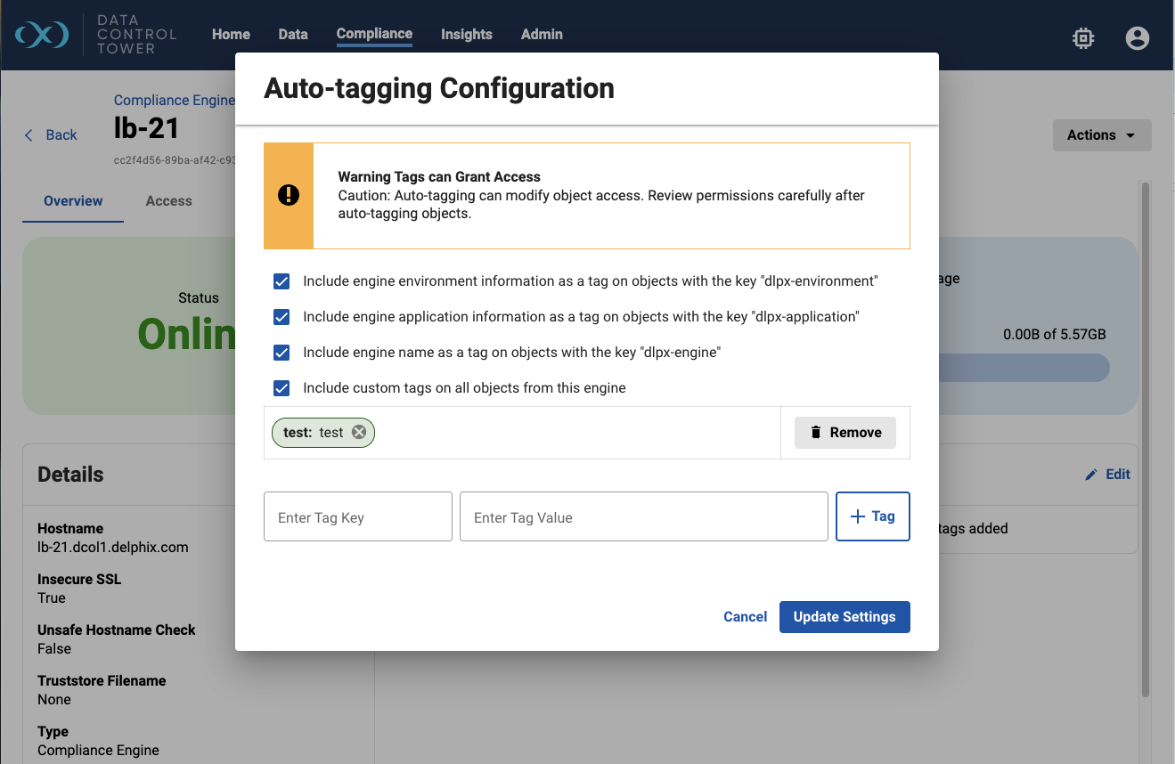 To update the auto-tagging configuration’s custom tags on a pre-registered engine, the account must have the Configure custom auto-tagging on the ENGINE object they wish to update.