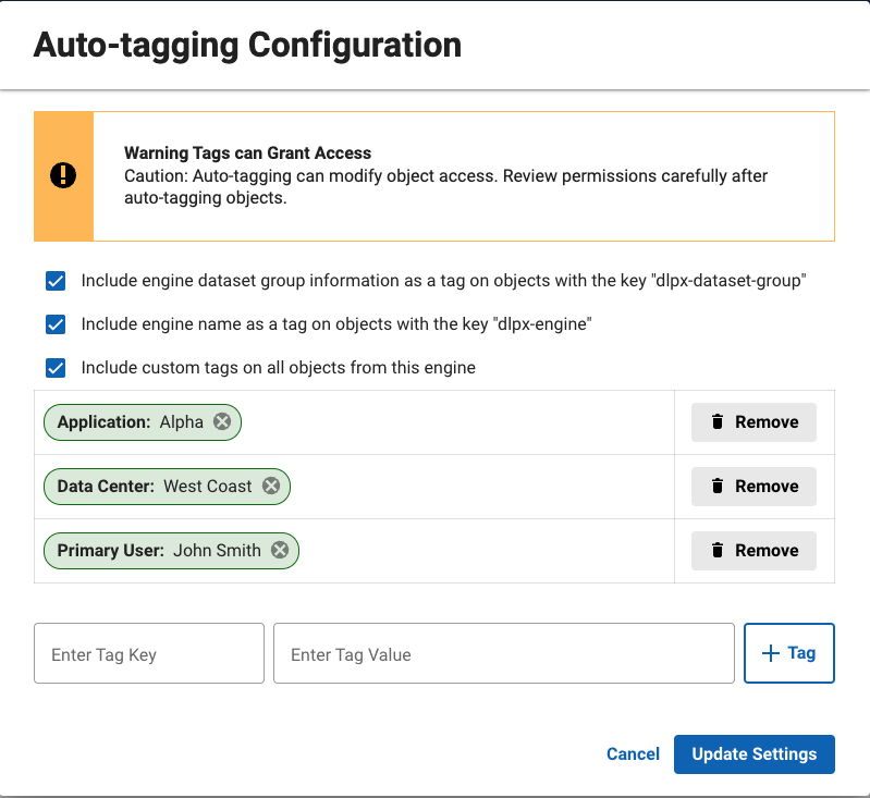 Users can now define (per connected engine) a series of custom tags applied to all objects pulled into DCT via telemetry, enabling a fast and efficient way to populate tags within DCT. This will stay in sync with the engines since objects are created or deleted until the feature is deactivated, during which time the tags will persist.