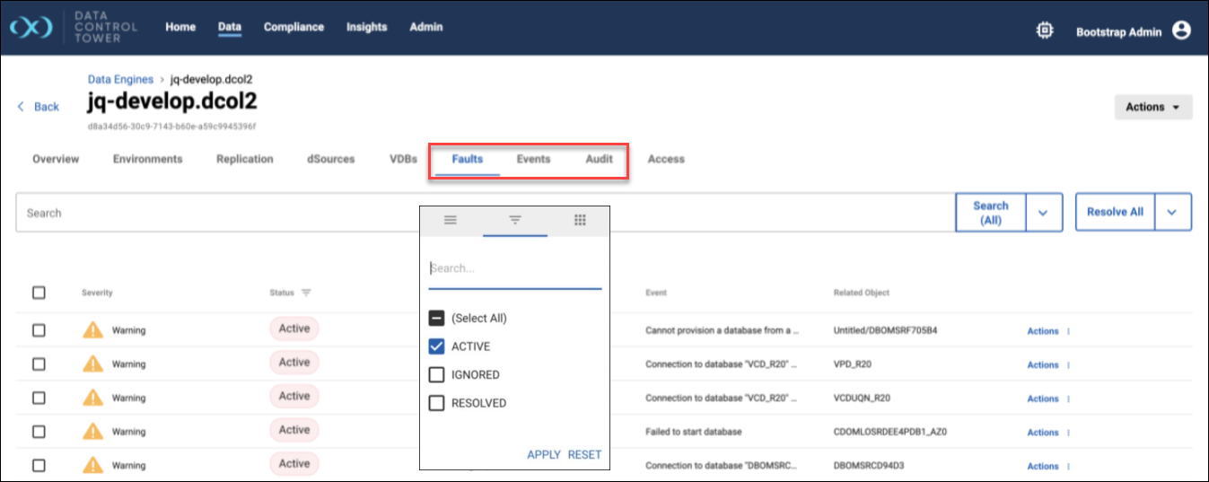 Faults, Events (Alerts), and Audit (Actions) tabs are made available to the UI via the details page of a Continuous Data engine. By default, the faults table only shows Active faults. You can choose to show faults with other statuses by configuring the column filter for the Status column.