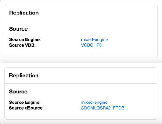 A replication details box will appear on the VDB or dSource tab showing the Source Engine and Source VDB/dSource for replication.