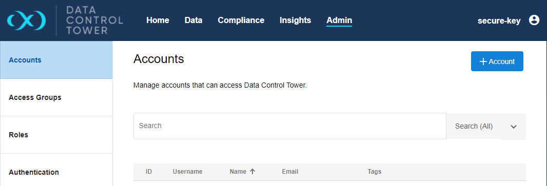 Navigate to Admin > Accounts, click the “+ Account” button, and complete the form.
