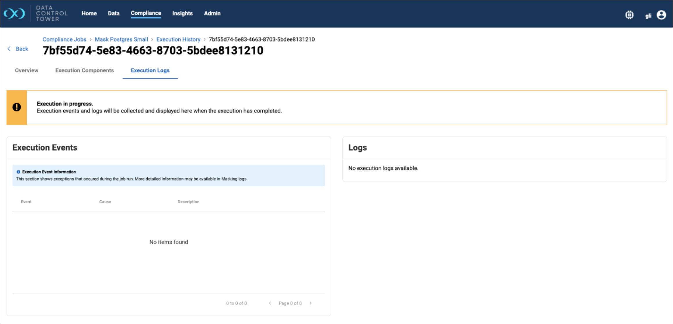 Events and logs are only available when the execution enters a final state (i.e. succeeded, failed, or warning). Before then, this tab will show a warning message. Once the execution transitions to a final state, this page should update once the data becomes available.