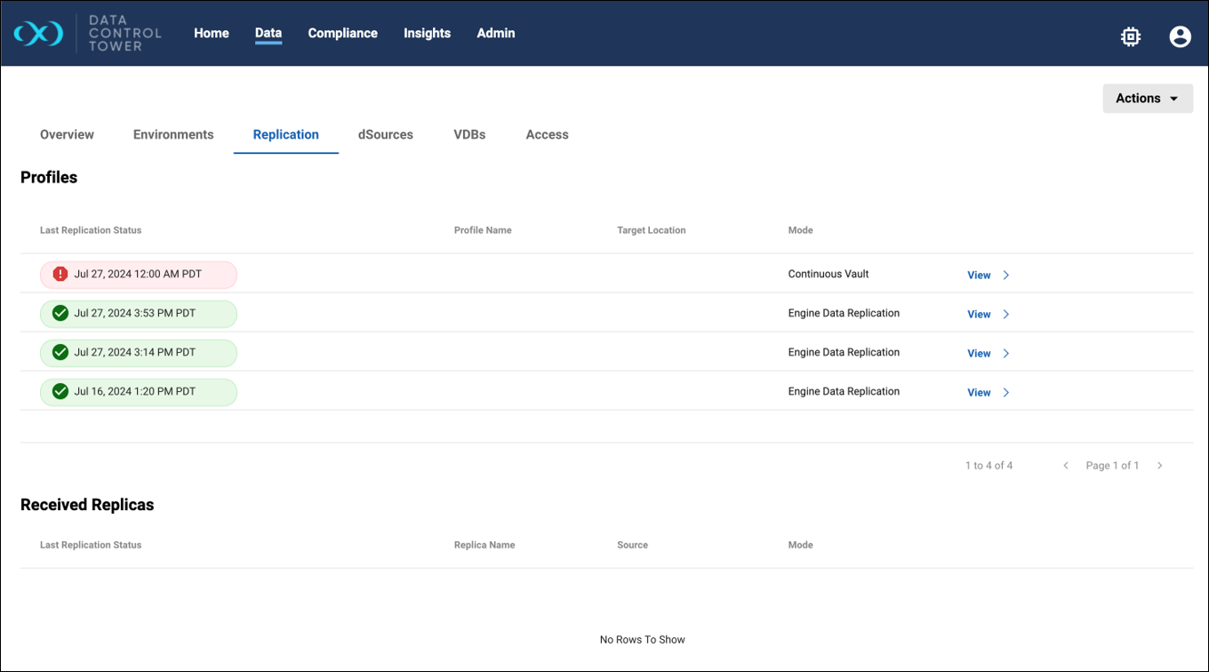 This feature allows users to see detailed information about a received replica. Use the View button available for each replica in the received replica list under Data > Data Engines > Engine Details View > Replication tab.