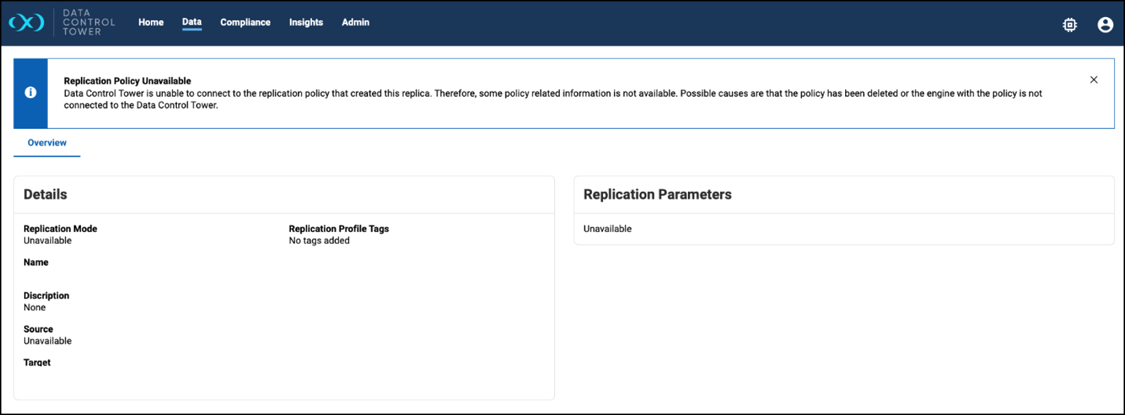 • In the Overview tab, details of the replica and its corresponding replication policy’s details are displayed. If the replication policy is not available on DCT, a banner is shown to indicate.