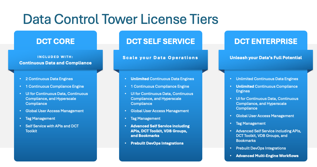 Data Control Tower has three tiers that determine available functionality and enabled use-cases via the DCT UI and API. They are Core, Self Service, and Enterprise, described in detail below.