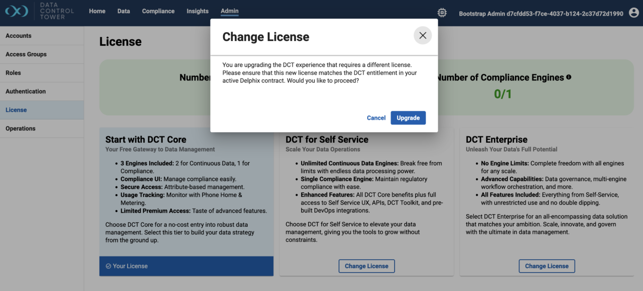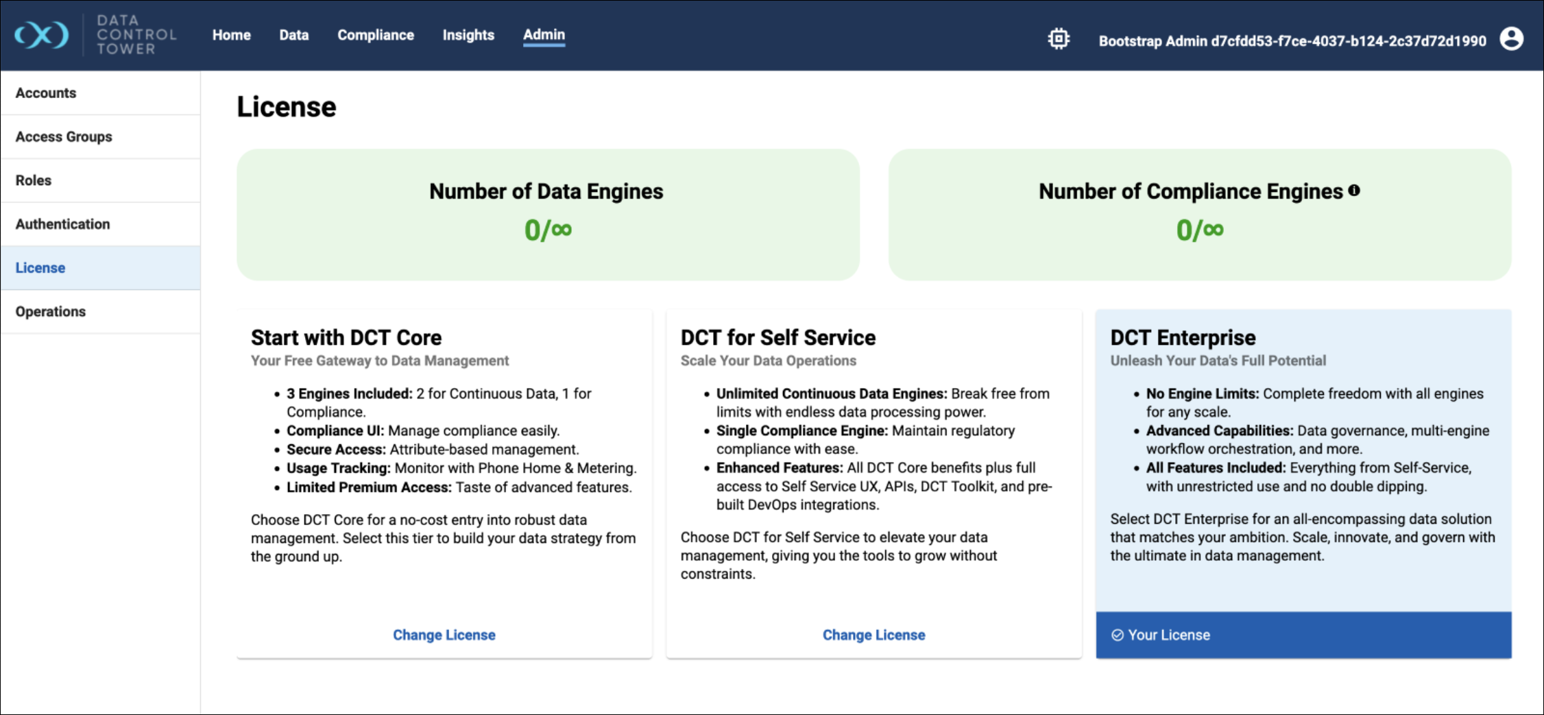 Navigate to the Admin tab, then select the License section on the left side. The UI will show restrictions for each license tier, the currently selected tier (DCT Enterprise, in this example), and the current engine counts.
