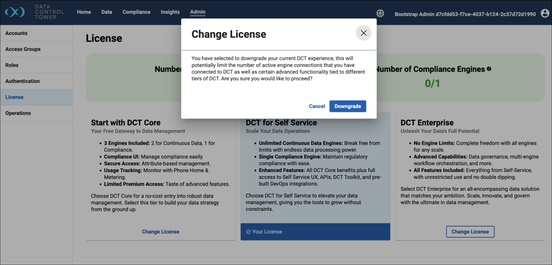 Downgrades will be blocked if prerequisites (e.g., DCT has more than the number of allowed engine connections for that license tier) are not met. This is to prevent loss of data as disconnecting an engine will remove the metadata associated with that engine.