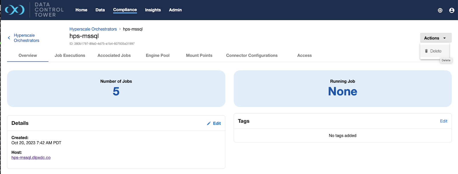Unregistering a Hyperscale Orchestrator and removing all its data from DCT can be done via the DELETE API or directly in the UI via the Actions menu.