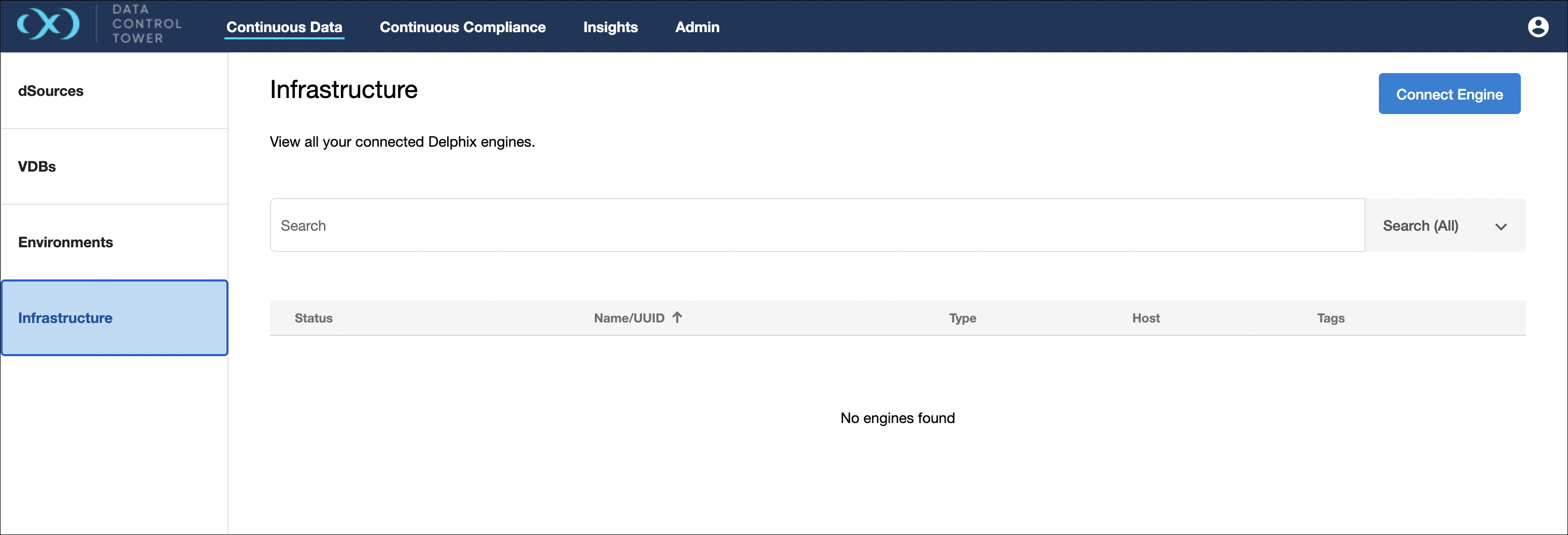DCT provides a near real time list of all connected continuous data engines and lists them in an aggregate view. From the screen displayed below, Delphix administrators can easily view and manage their engine connections.