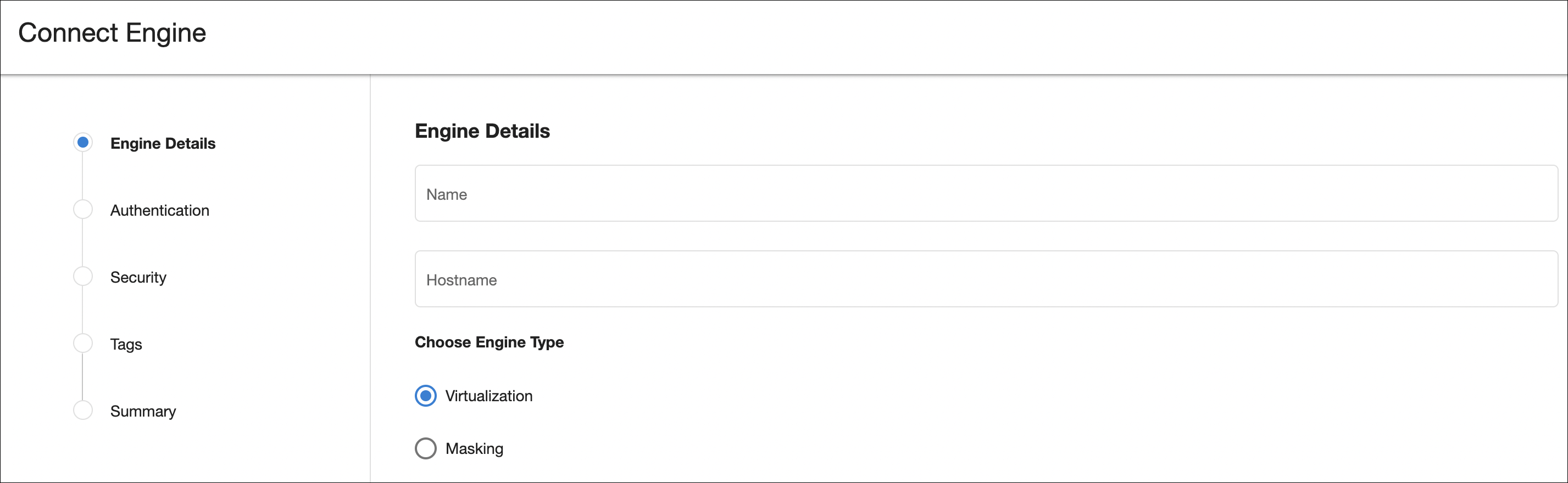 From this screen, administrators will be able to manage engine connects via the “Connect Engine” button on the top right corner. By clicking this button, the below dialogue will appear asking for connection details. Note: DCT will access the engine as a registered user and, as detailed in the Deployment section, requires both a user name and password as well as admin level access on the engine.