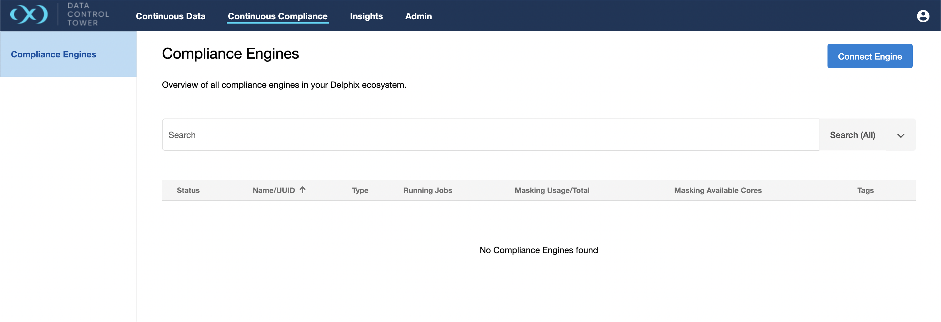 DCT also displays continuous compliance infrastructure as a dashboard list as part of its Central Management set of functionality. The below screen can be found under the “Continuous Compliance” button on the DCT header and displays all compliance engines with associated metadata.