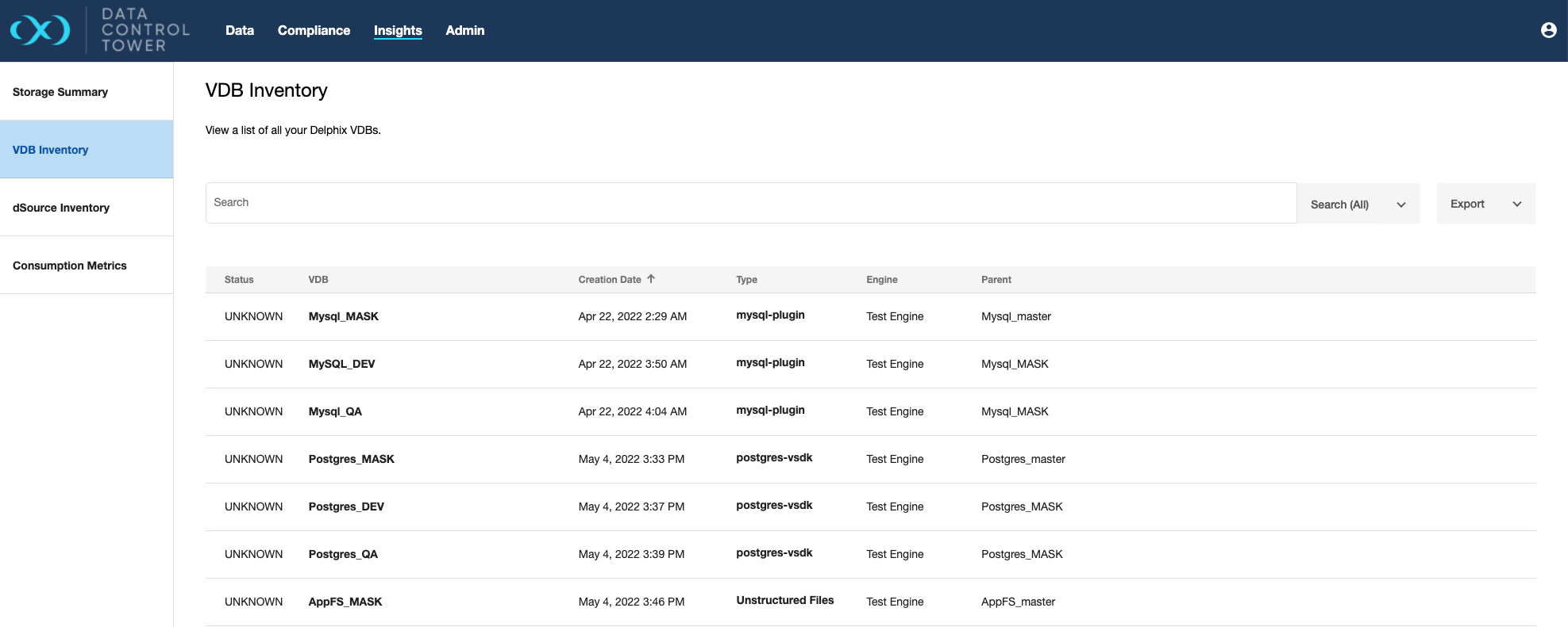 DCT provides global reporting of real-time statuses. This section will break down all of the reports in the "Insights" Section. Note: all insight dashboards have the capability of "exporting" to a CSV or JSON format.