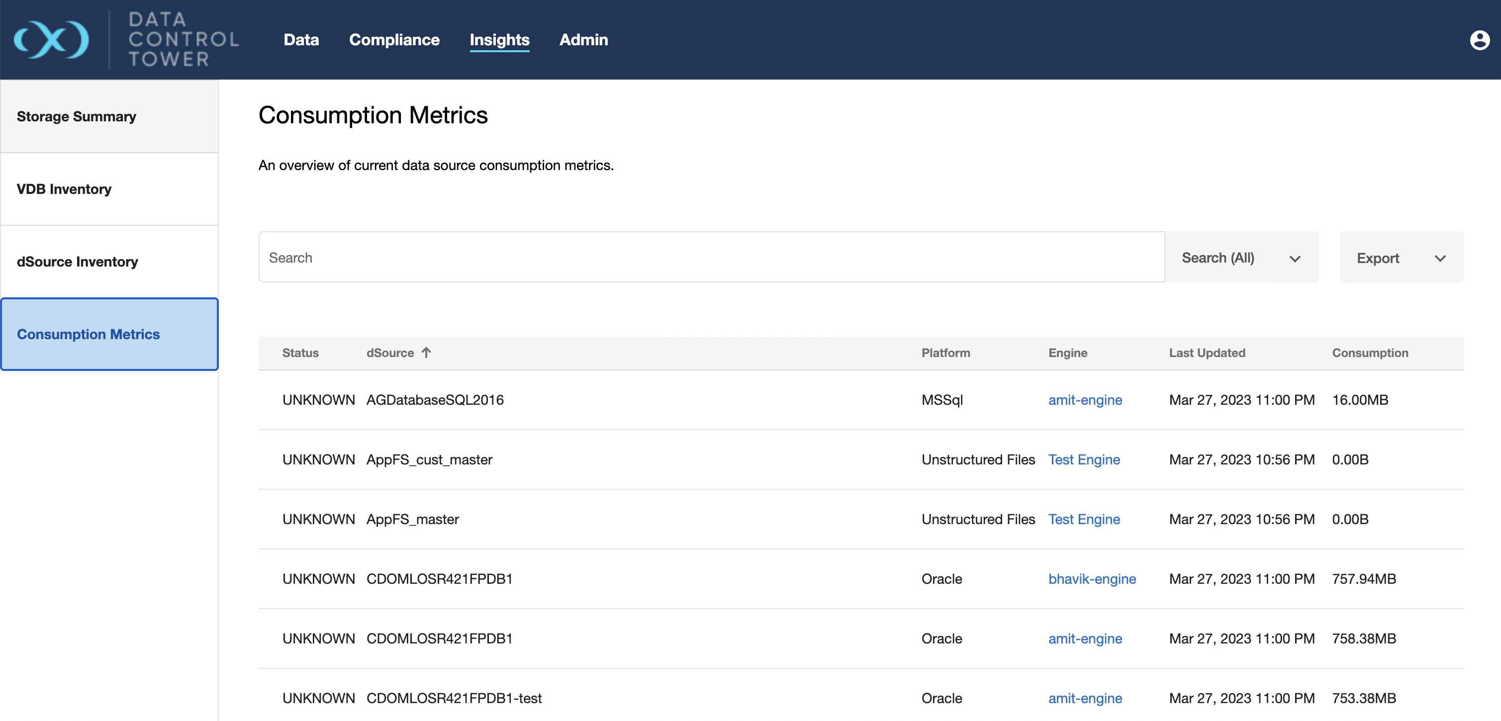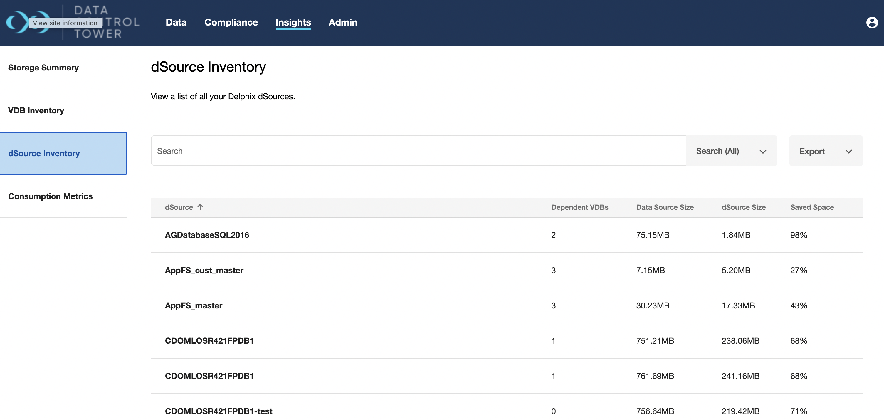 This page gives a complete list of all dSources along with relevant details including VDB lineage count and storage consumption sizing.