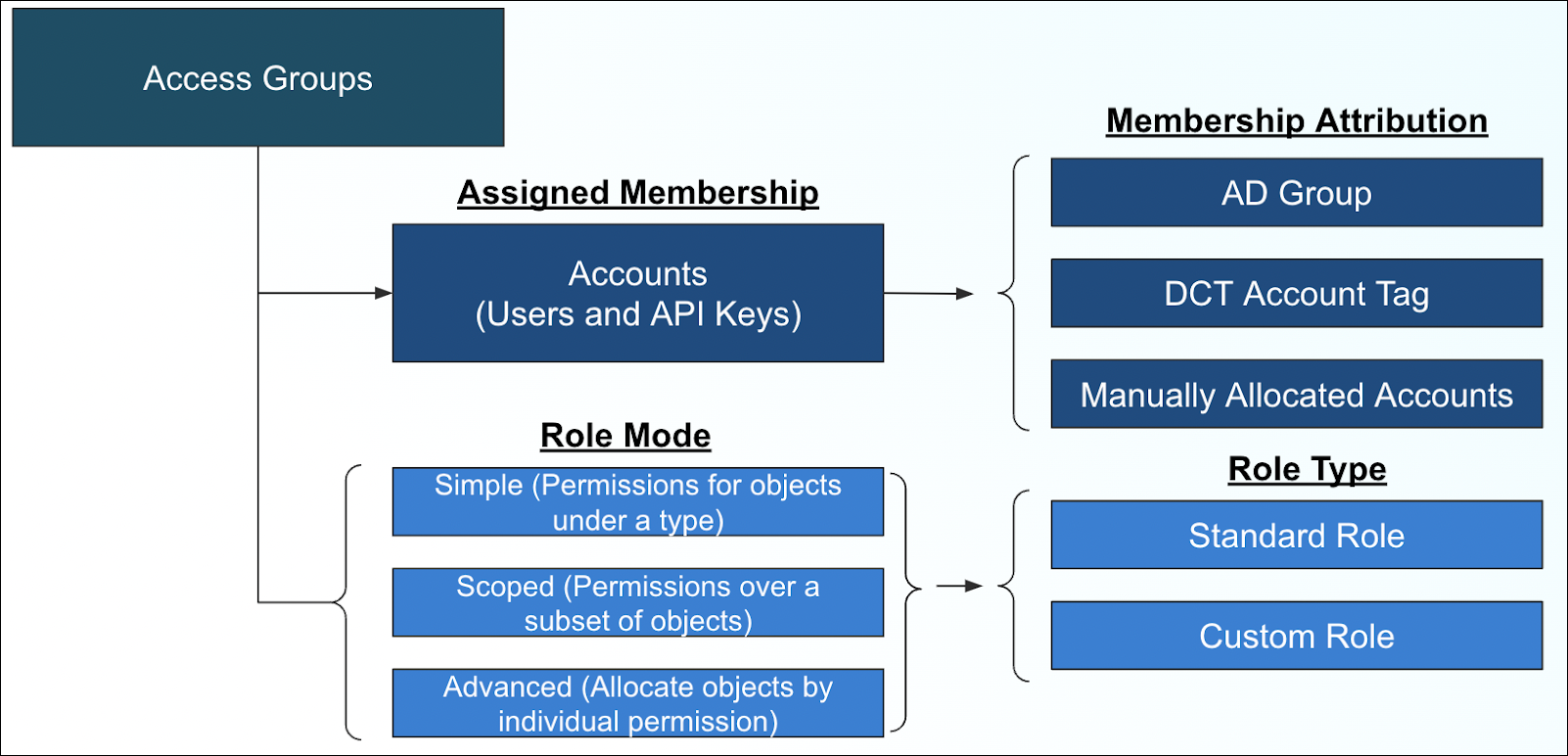 Accounts represent generalized users; a human user, an API key, or both. An account can belong to multiple Access Groups, but it is strongly recommended to maintain a dedicated Access Group for an account or group of accounts, to prevent privilege creep. Accounts can be attributed to Access Groups via LDAP/Active Directory Group attributes, DCT Account Tags, or manually adding accounts.