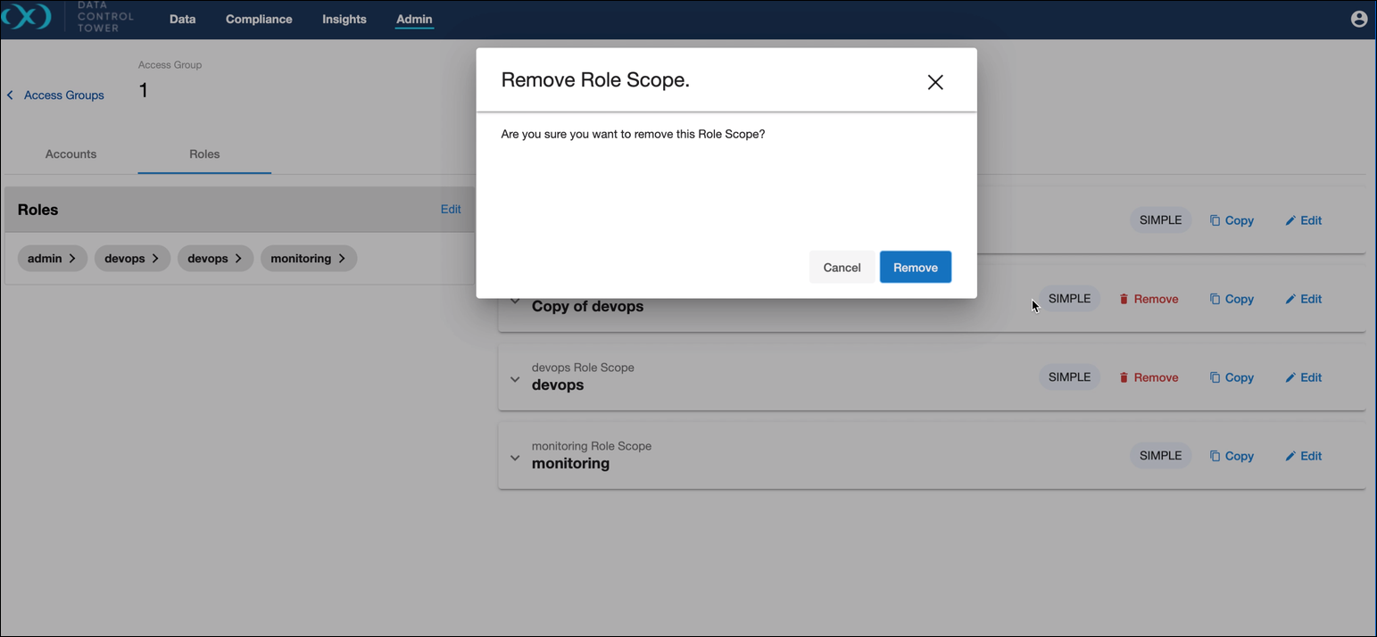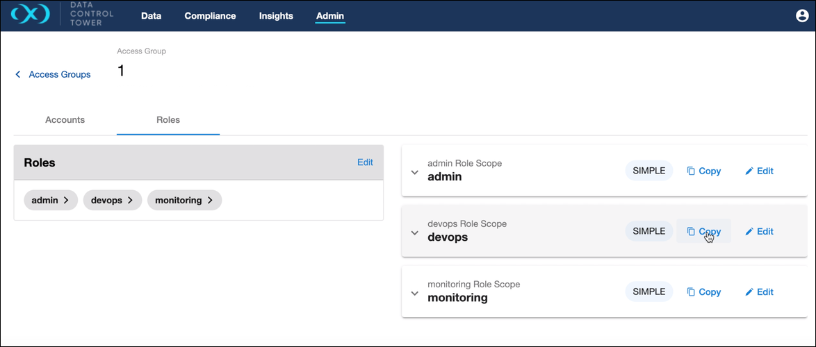Roles can be considered a collection of permissions. Attributing a role into an Access Group first starts by identifying a “mode”. DCT currently supports both simple and scoped modes for roles, with the plan to introduce advanced mode in a subsequent release.