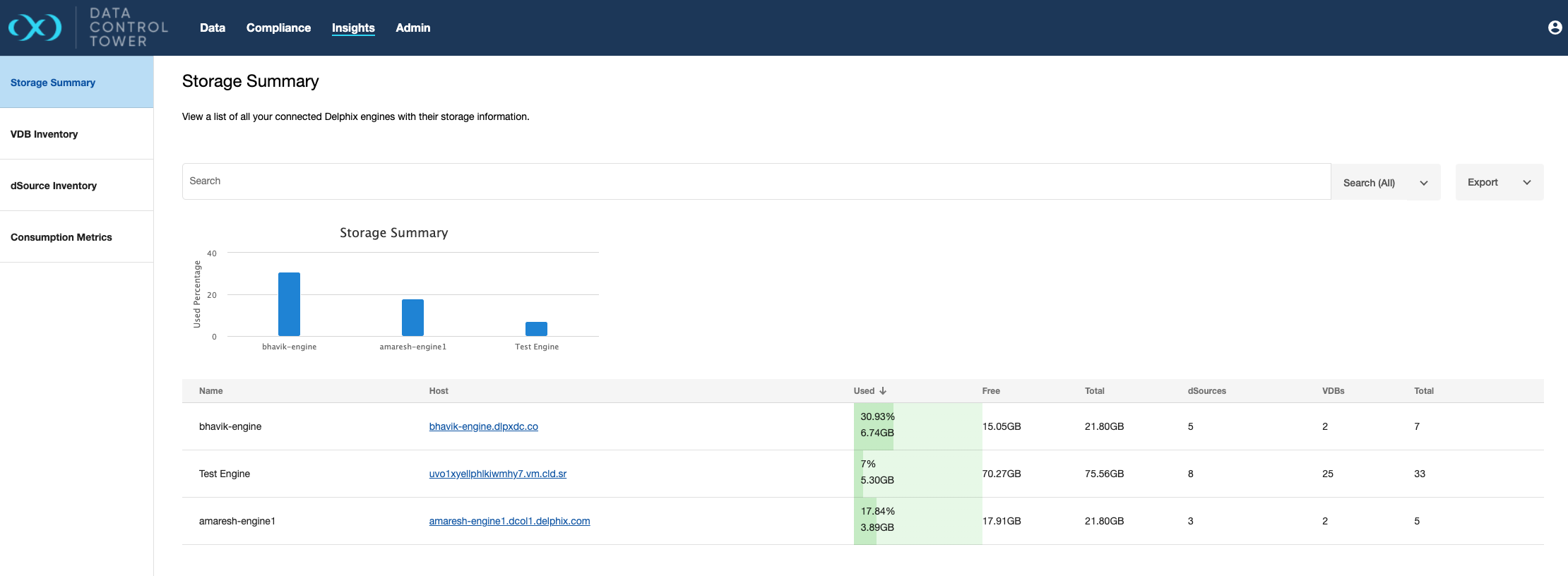 This section gives a real-time perspective of block storage capacity on each connected engine as well as relevant metadata such as capacity consumption percentage and object count.