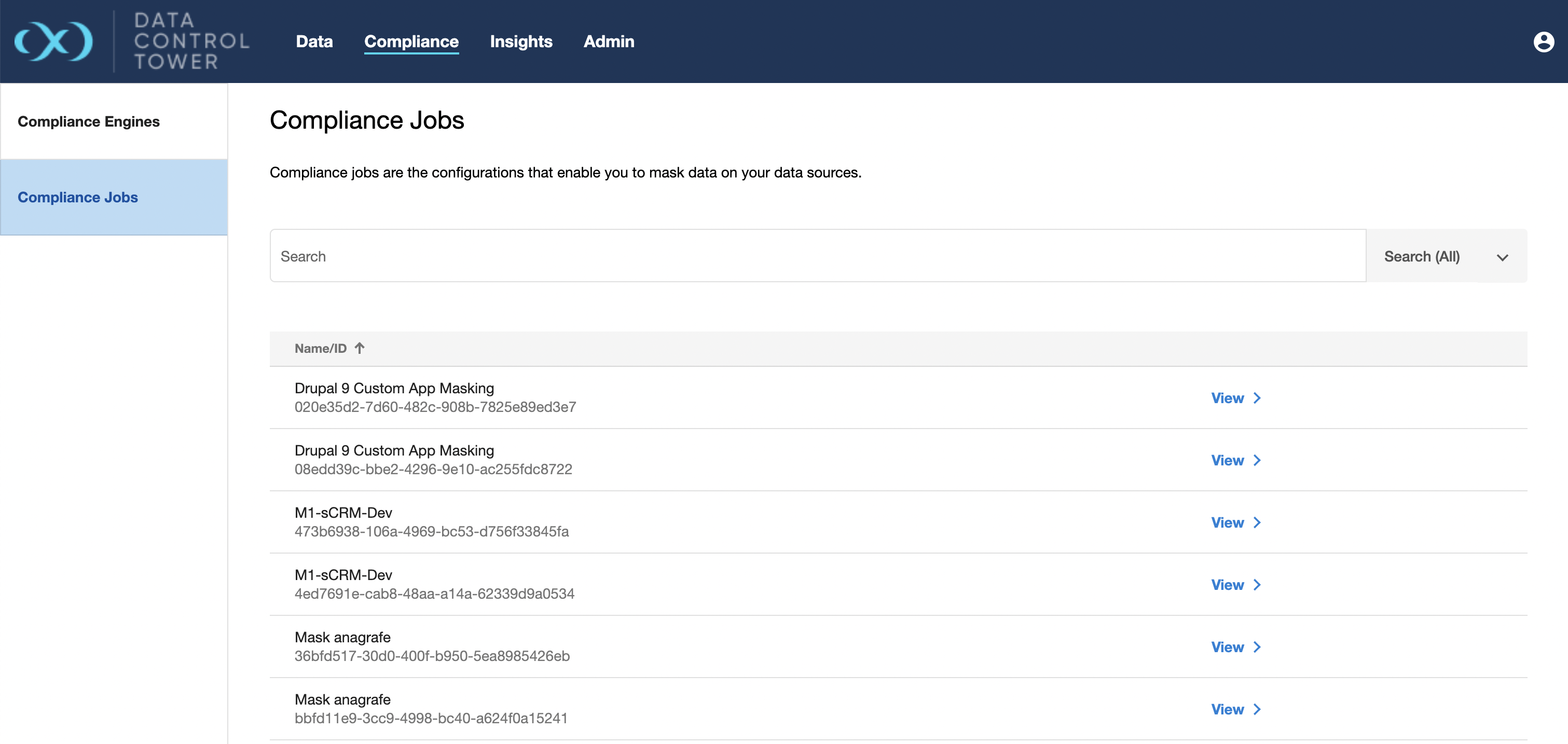 When connected to a Continuous Compliance engine, DCT will sync and create references to every compliance job on the engine. All of those job references can be found in the global compliance list, which is a taggable, filterable, sortable, and searchable list of all compliance jobs across a connected Delphix ecosystem.