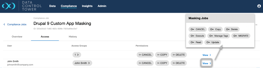 Users are able to audit which users have access to this particular compliance job, what access group they belong to, and the associated permissions that each user has on this job. Admins are able to click on the "View" button to access further details under the access control screen related to that specific user.