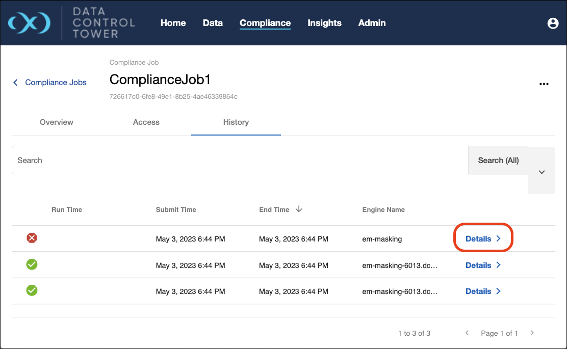 The compliance jobs page also includes job execution history. Execution information will be recorded and displayed on this tab, and includes the status (success, running, failed), run time, submit, and end timestamps, and engine on which it ran. Additionally, clicking the “details” button for an execution will display its report.