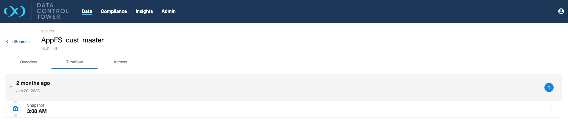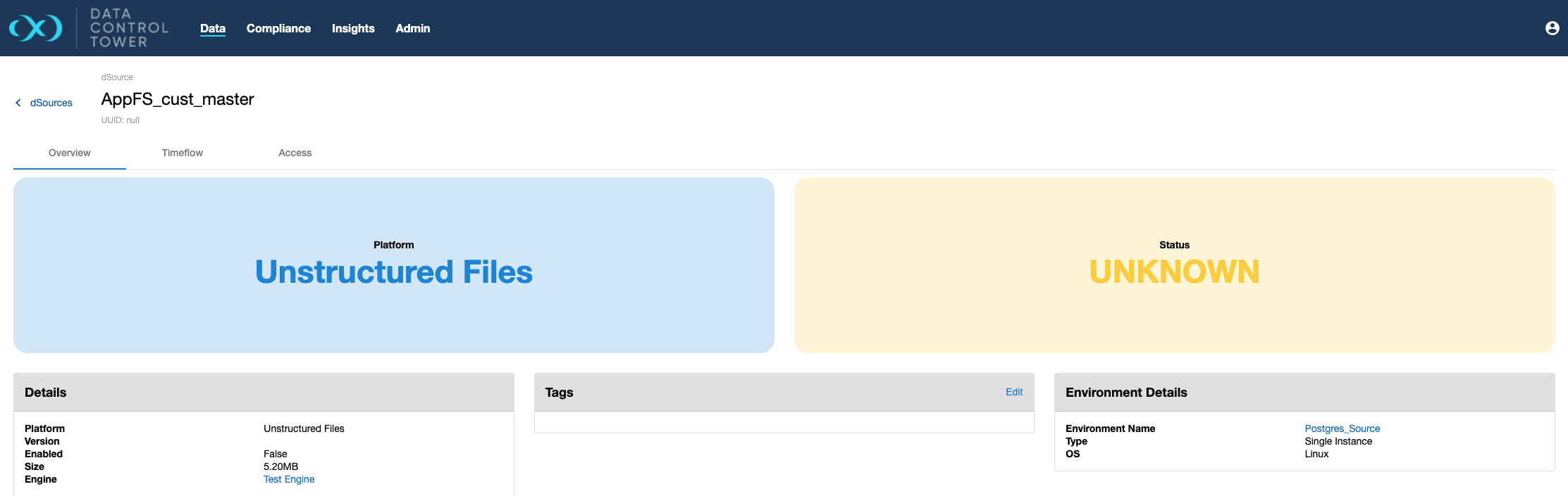 Individual dSource details can be viewed and acted upon by clicking down on a particular dSource's detailed view. Once clicked, users will be sent to an "overview" tab that provides relevant metadata related to the dSource.