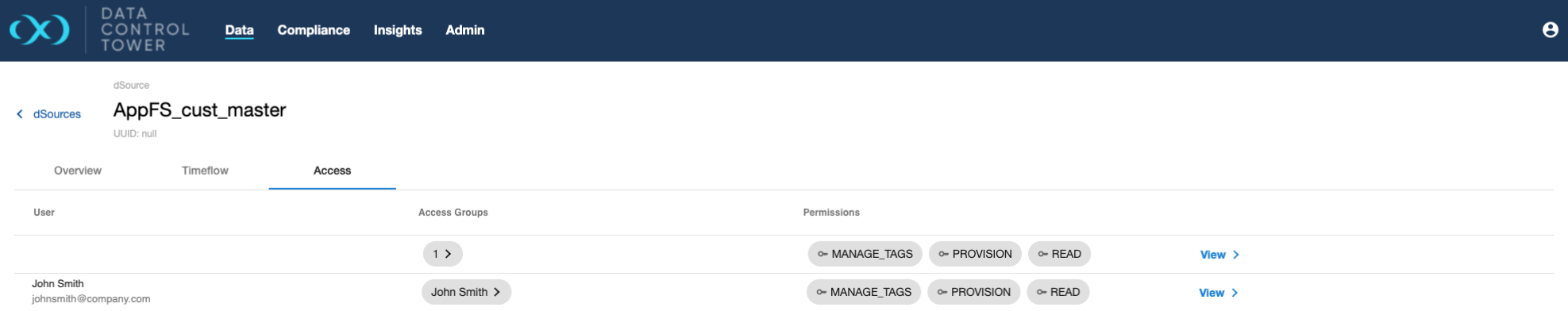 Users are able to audit what other users have access to a particular dSource, what access group they belong to, and the associated permissions that each user has on that particular dSource.