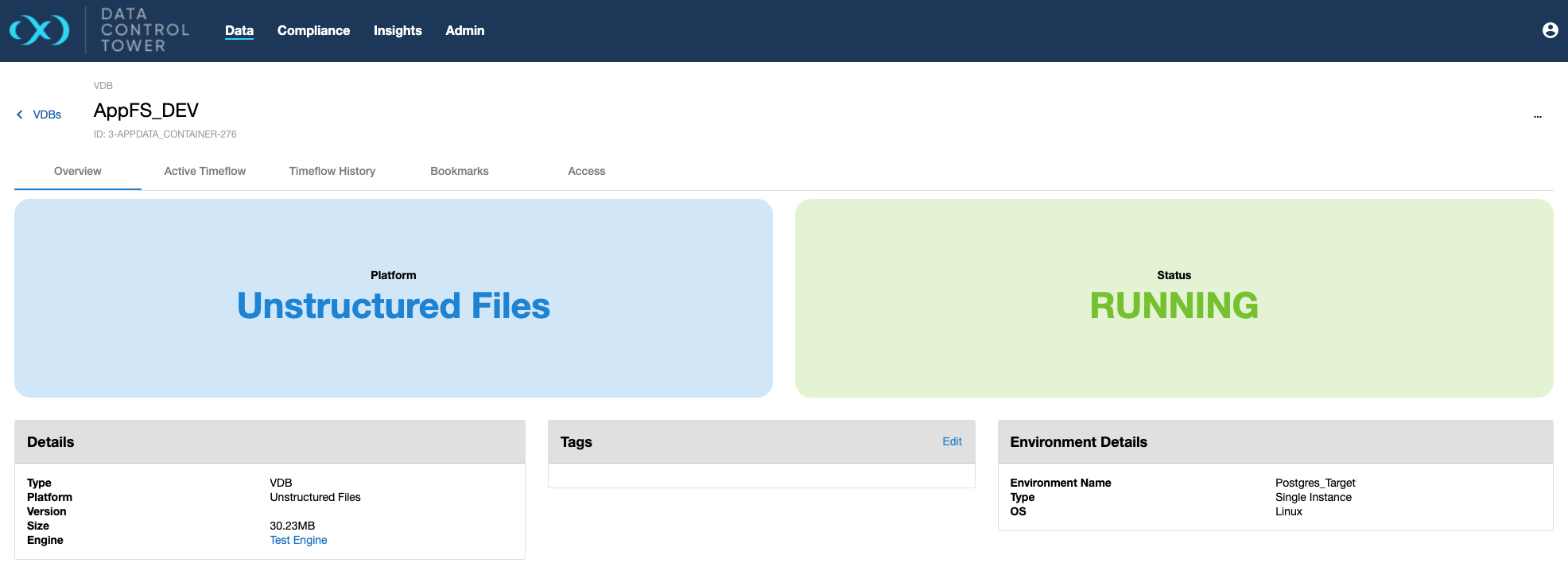 Individual VDB details can be seen and acted upon by clicking down on a particular VDB detailed view. Once clicked, users will be sent to an "overview" tab that provides relevant metadata related to the VDB.