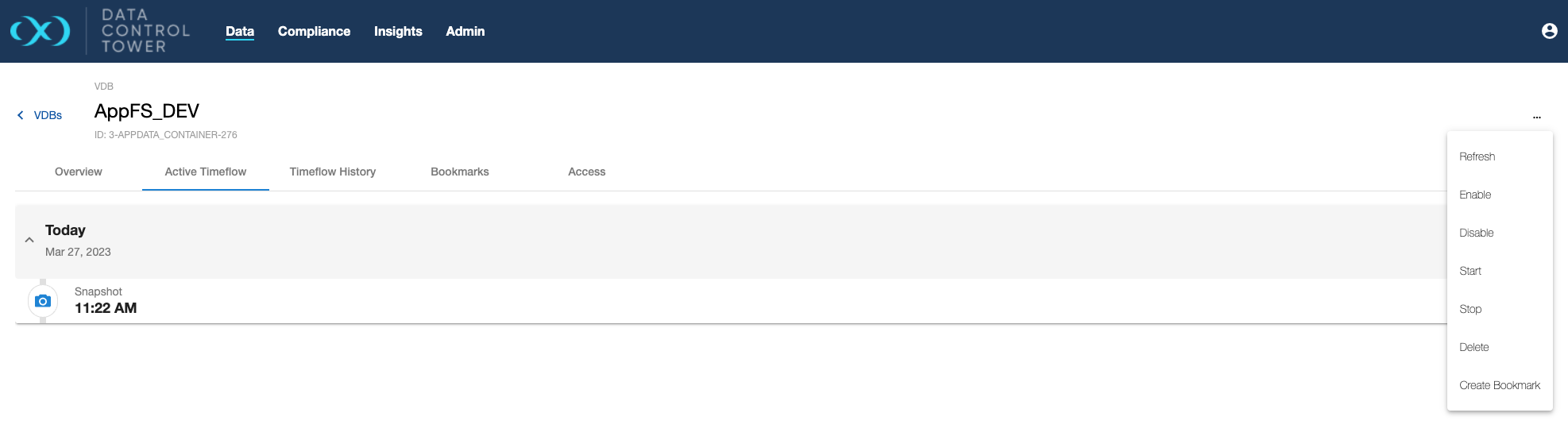 Actionable snapshots are listed on the "active timeflow" tab - from this page, users can refresh, enable, disable, start, stop, delete, and create bookmarks on the VDB. Navigate to the Continuous Data workflows section, then VDB operations in the UI, and see Active timeline UI for more details.