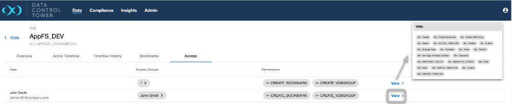 Users are able to audit which users have access to this particular VDB, what access group they belong to, and the associated permissions that each user has on that VDB. Admins are able to click on the "View" button to access further details under the access control screen related to that specific user.
