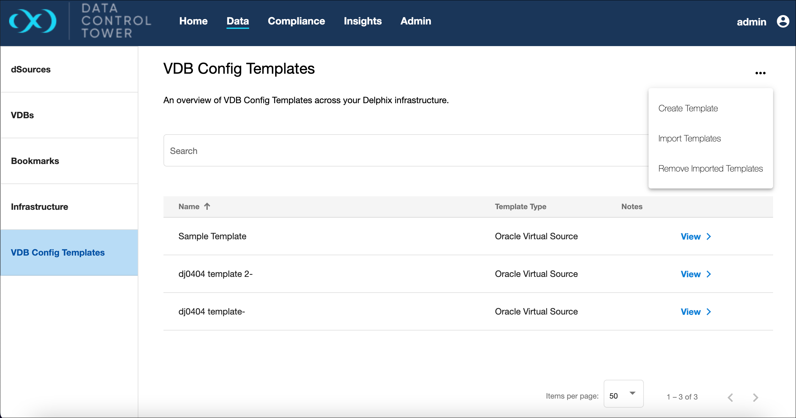 Importing and removing imported VDB templates from connected engines is an available action from the VDB Config Templates page.