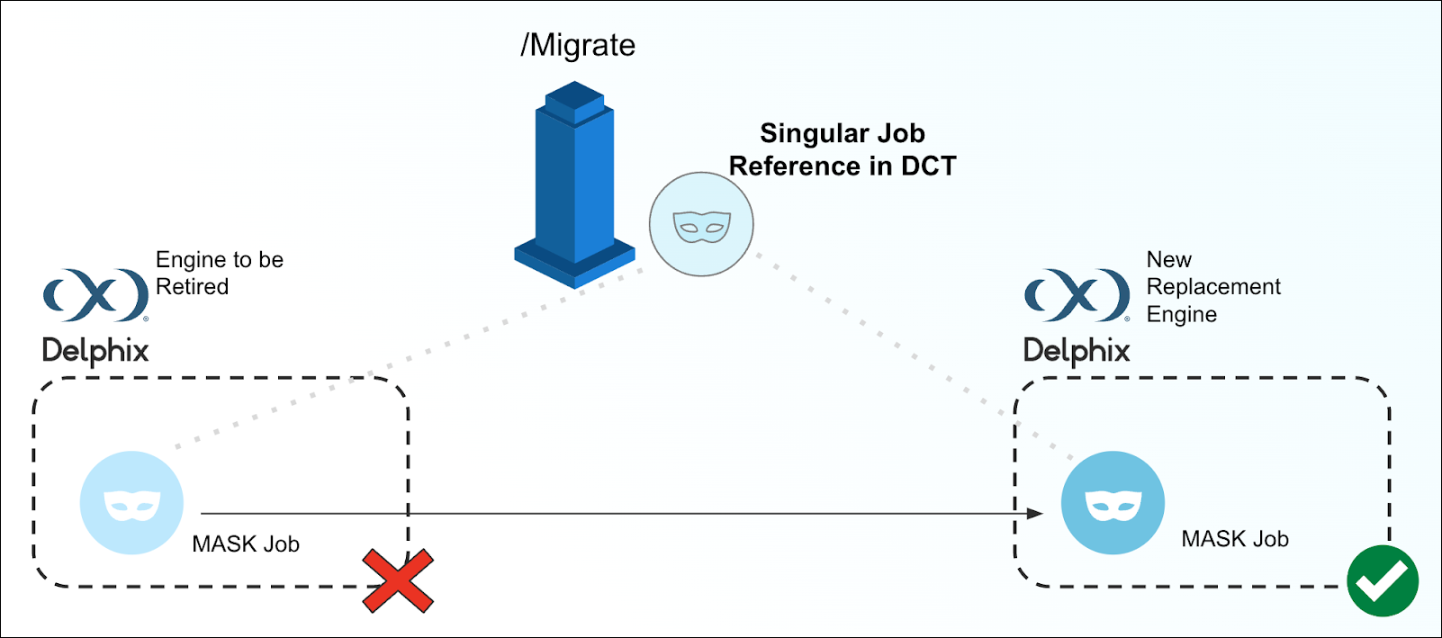 The Migrate endpoint moves a job from one engine to another without any duplicates. This endpoint is useful for consolidating masking jobs (i.e. moving jobs to a fresh engine ahead of the original being retired or consolidating two development engines into a single one for administrative simplicity). This means that a job will continue to have only a single instance with no additional jobs being created. This job will maintain its same reference within DCT.