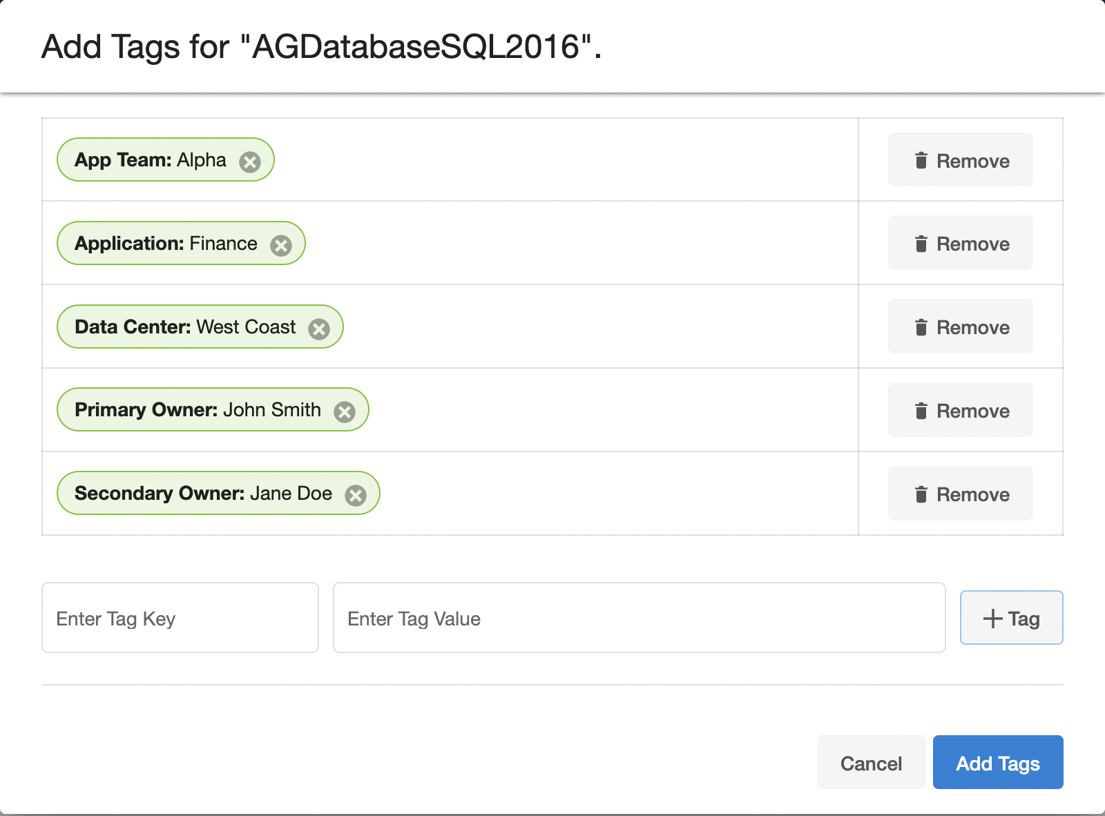 Tags can be managed from the UI by selecting “View Tags” for a particular object on its global list page. The below example shows the tag configuration screen for a dSource “AGDatabaseSQL2016” and multiple tags have been added to characterize that particular object: