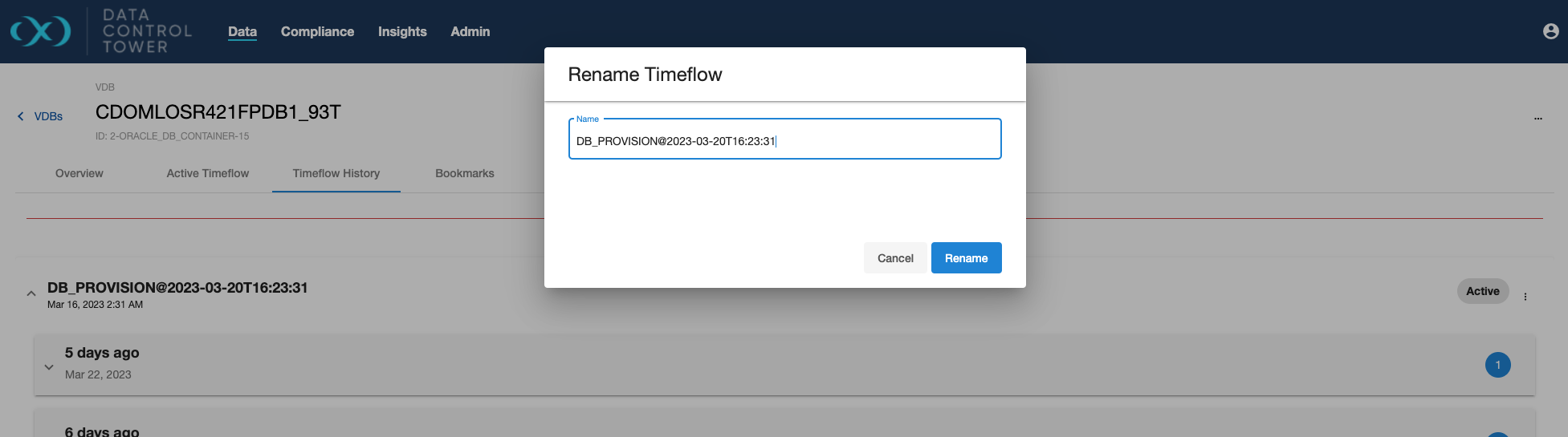 For developers, having the ability to catalog (name and tag) and reference past timelines is a critical aspect of application development such as performing ad hoc code validation or manual testing. The timeline history UI in DCT provides a home for single VDB visibility of all accessible timelines (note: timeline availability is controlled through capacity management and snapshot retention policies).