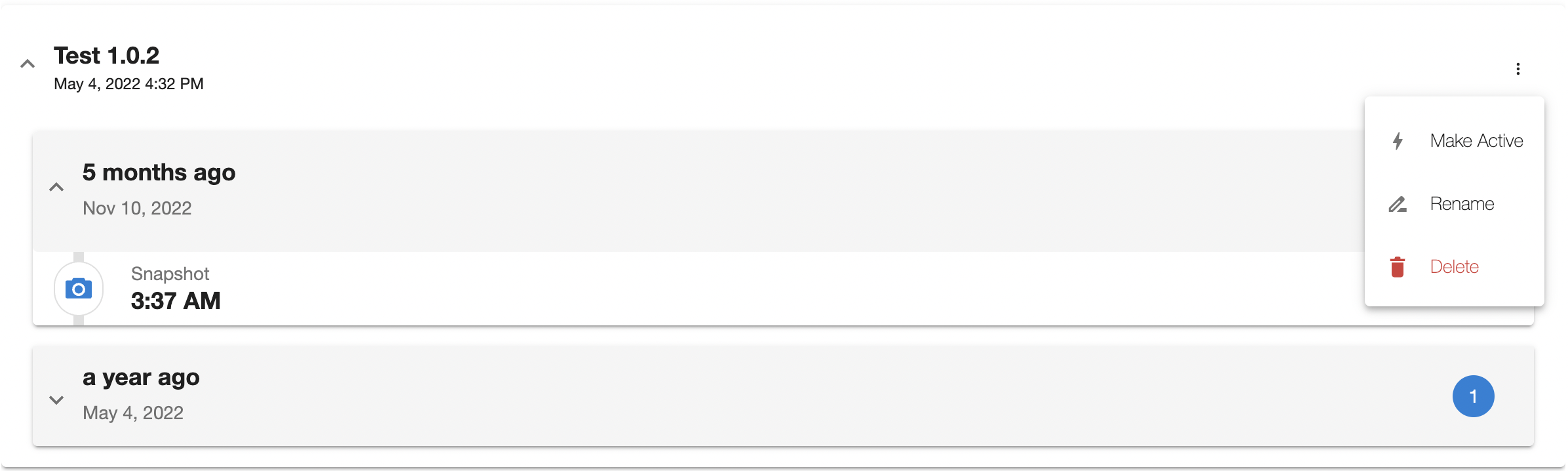 “Make Active”, a developer can reference any past timeflows and data represented therein by making a timeflow “Active”. This can be done by simply clicking on the timeflow of interest and selecting “Make Active”.