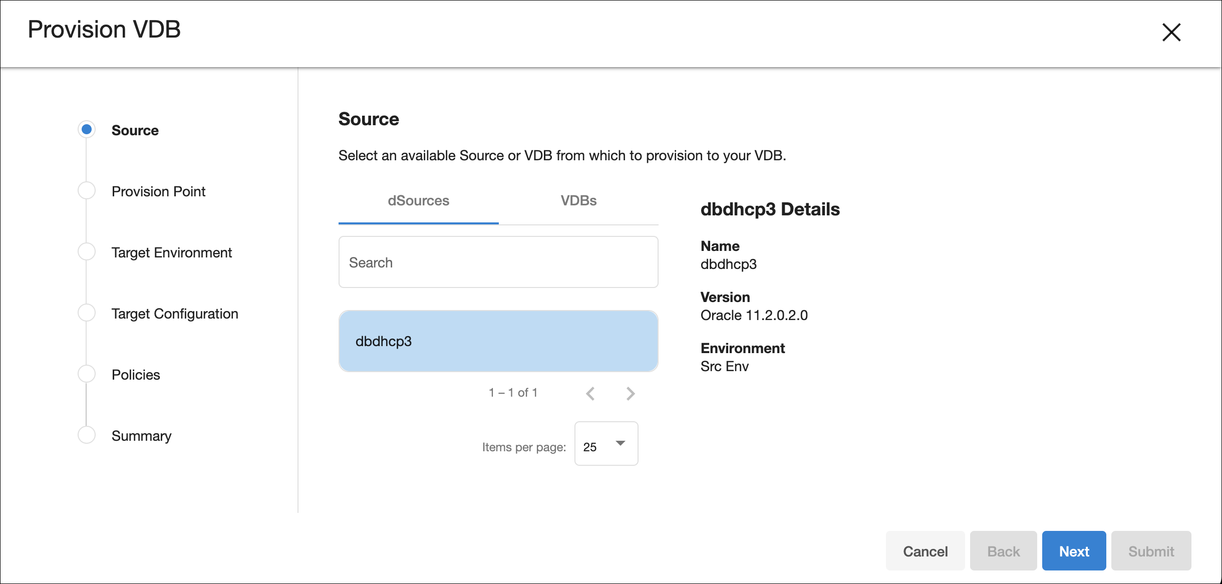 Extending the Developer Experience capability in DCT, users can now provision single-tenant Oracle databases from the user interface using an intuitive wizard workflow. Located on the VDB page is a Provision VDB button that opens the provisioning wizard. From here, users can see provisionable sources, environments, and snapshot policies available across all registered engines.
