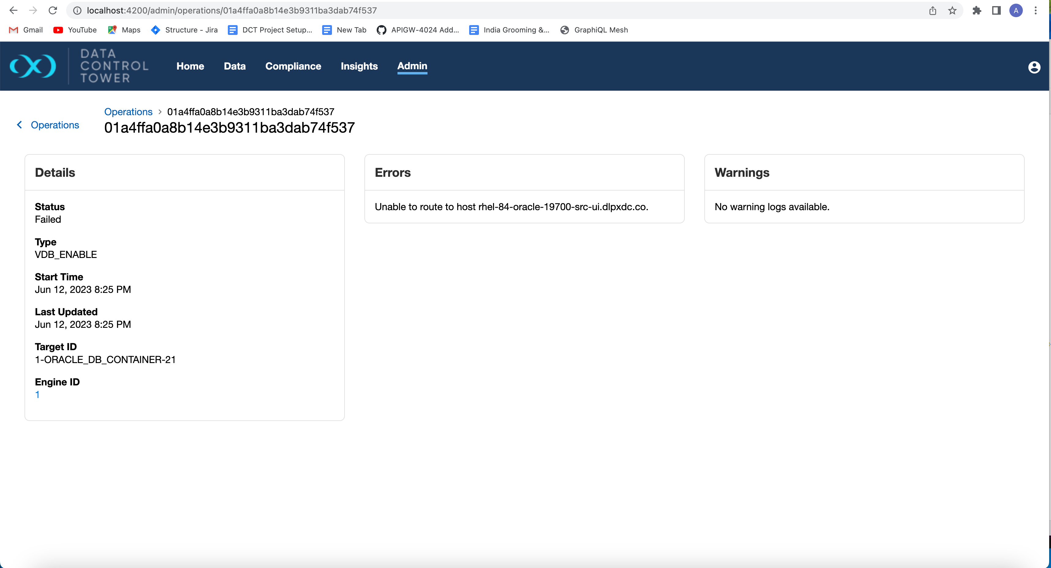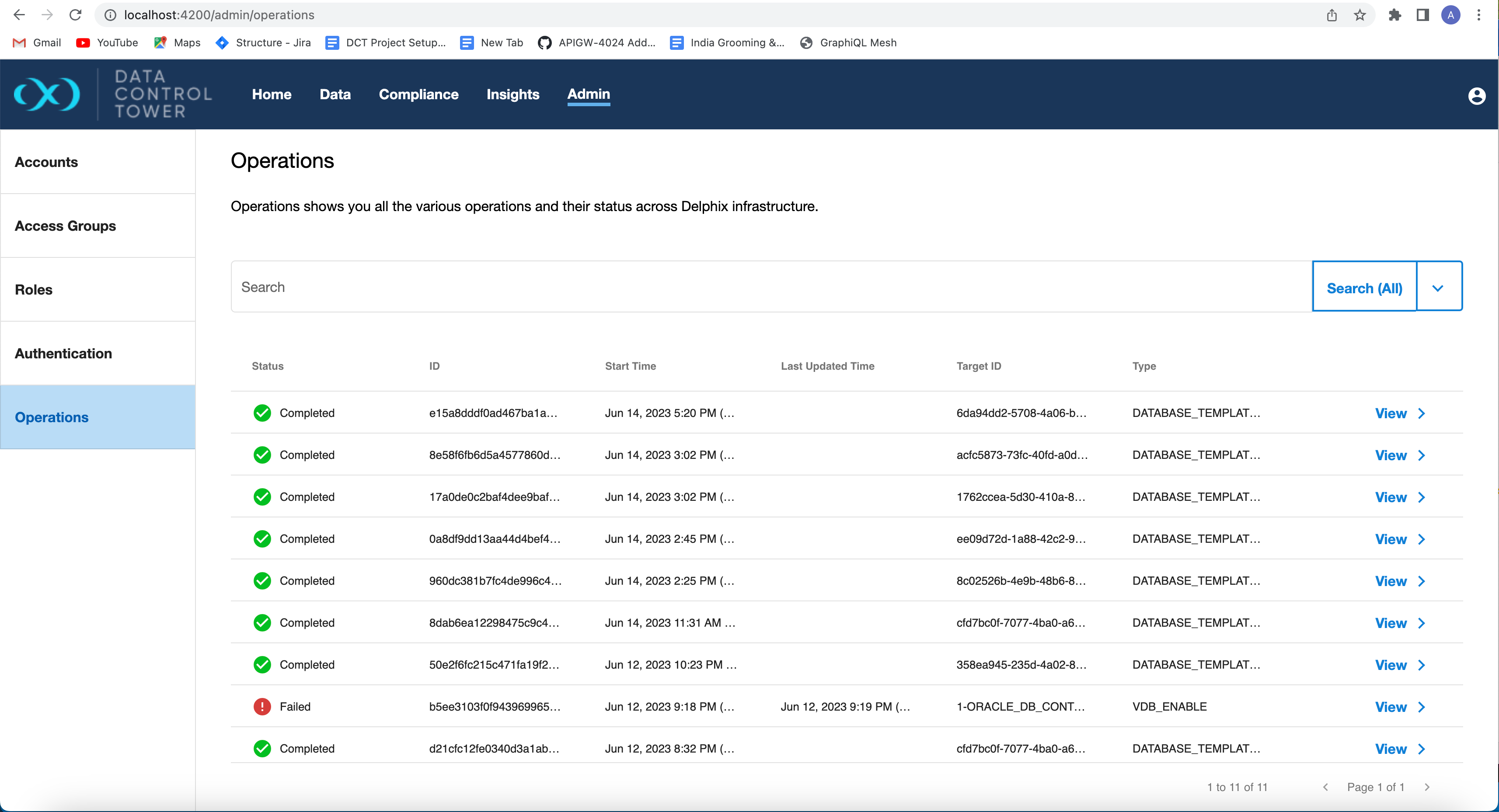 An Operations page is available under the Admin menu to display the list of all the DCT Jobs across Delphix infrastructures. It displays the relevant details for the operation, such as status, type of job, target id (refers to the id of the object on which the operation has been performed), start time, last updated time, etc.