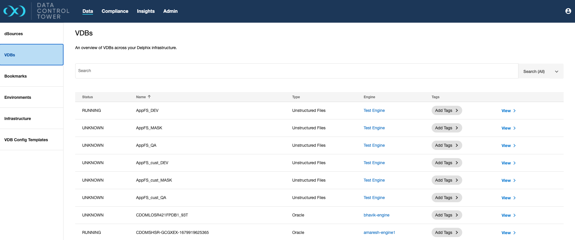 DCT provides the ability to view, search, sort, and filter all VDBs within a connected Delphix ecosystem. This page can be found under the Data section and is used to find and act upon all VDB if they have the appropriate access.