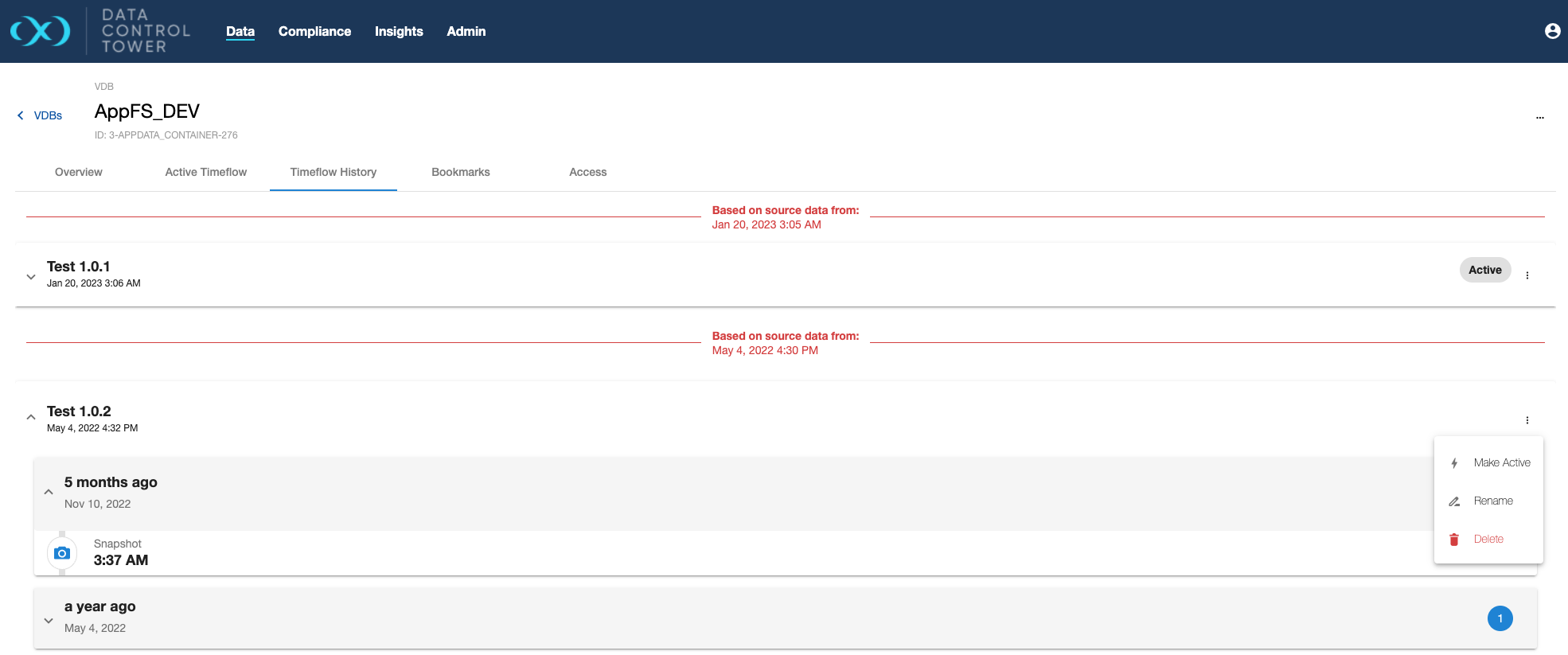 A chronological history of all non-active timelines (commonly referred to as timeflows) is shown under the "Timeflow History" tab. From this page, developers can curate their QA or Development work by renaming timeflows to match their testing history. Developers also have the ability to access old timeflow data by making a particular timeflow "active". Navigate to the Continuous Data workflows section, then VDB operations in the UI, and see Timeline history UI for more details.